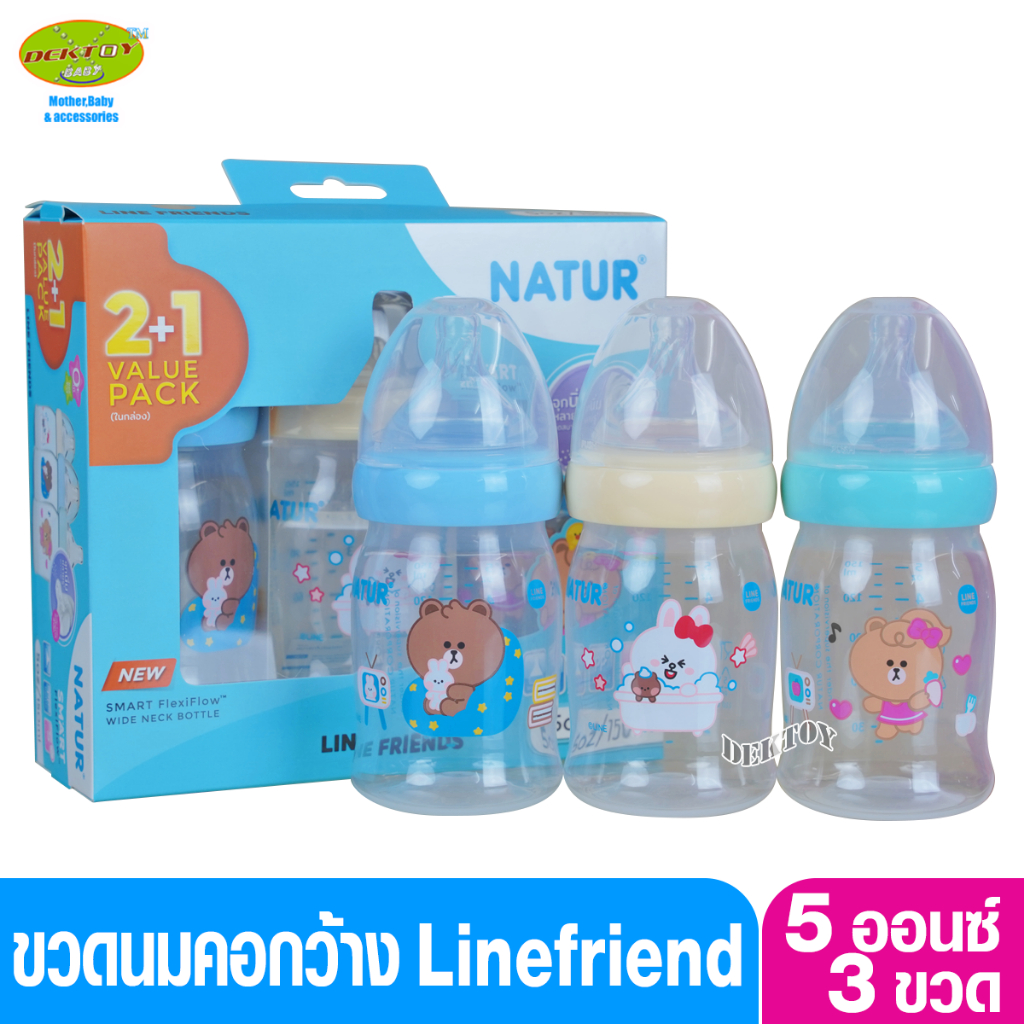 LINE FRIENDS Natur เนเจอร์ ขวดนมคอกว้างสมาร์ท จุกนิ่มหลายรู ดูดสบาย PP 5 ออนซ์ แพ็ก 2ฟรี1 ขวด 20013
