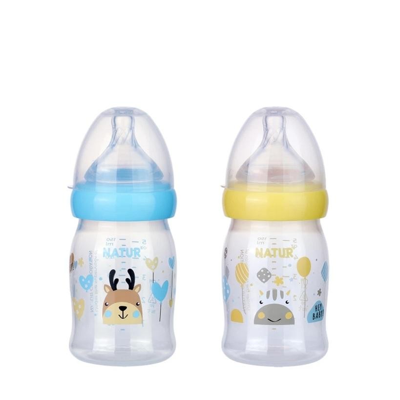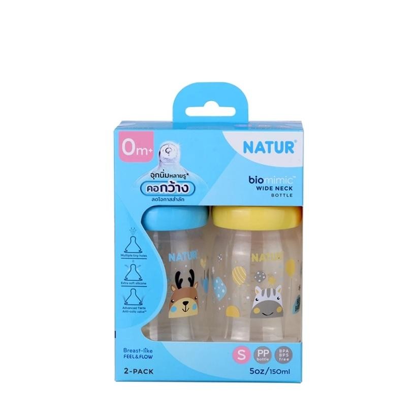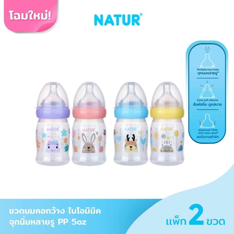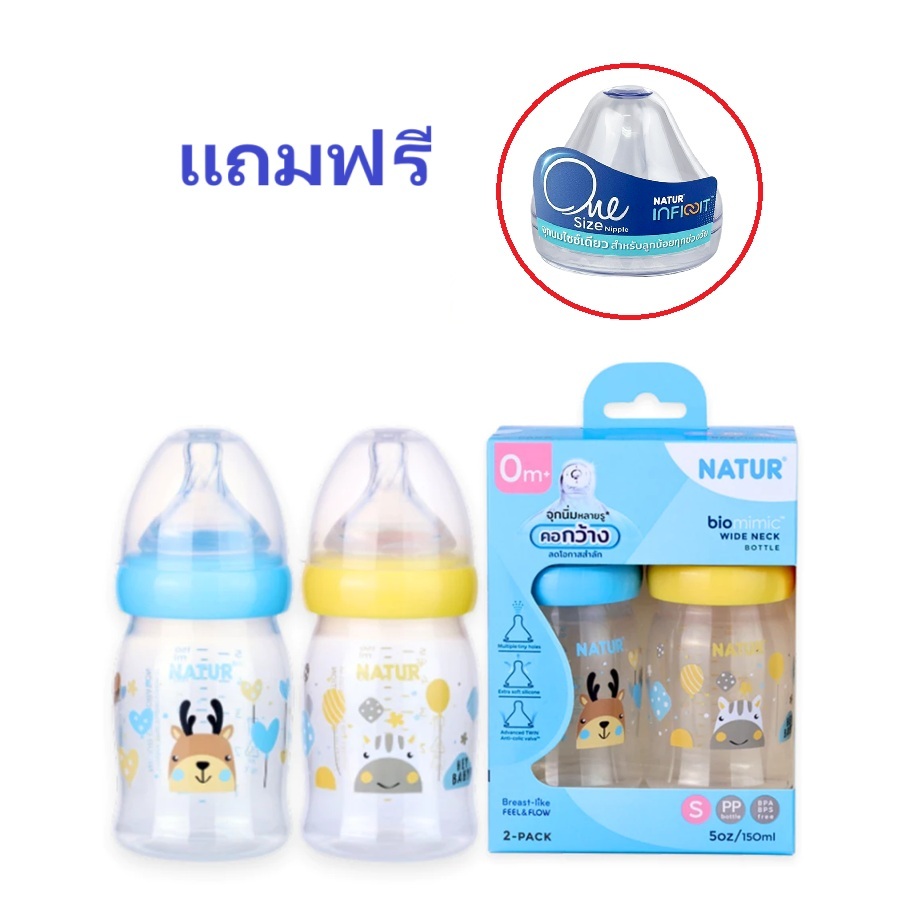 NATUR เนเจอร์ ขวดนมคอกว้างไบโอมิมิค 5oz แพ็ก 2 ขวด แถมฟรีจุกนม 1 แพ็ค
