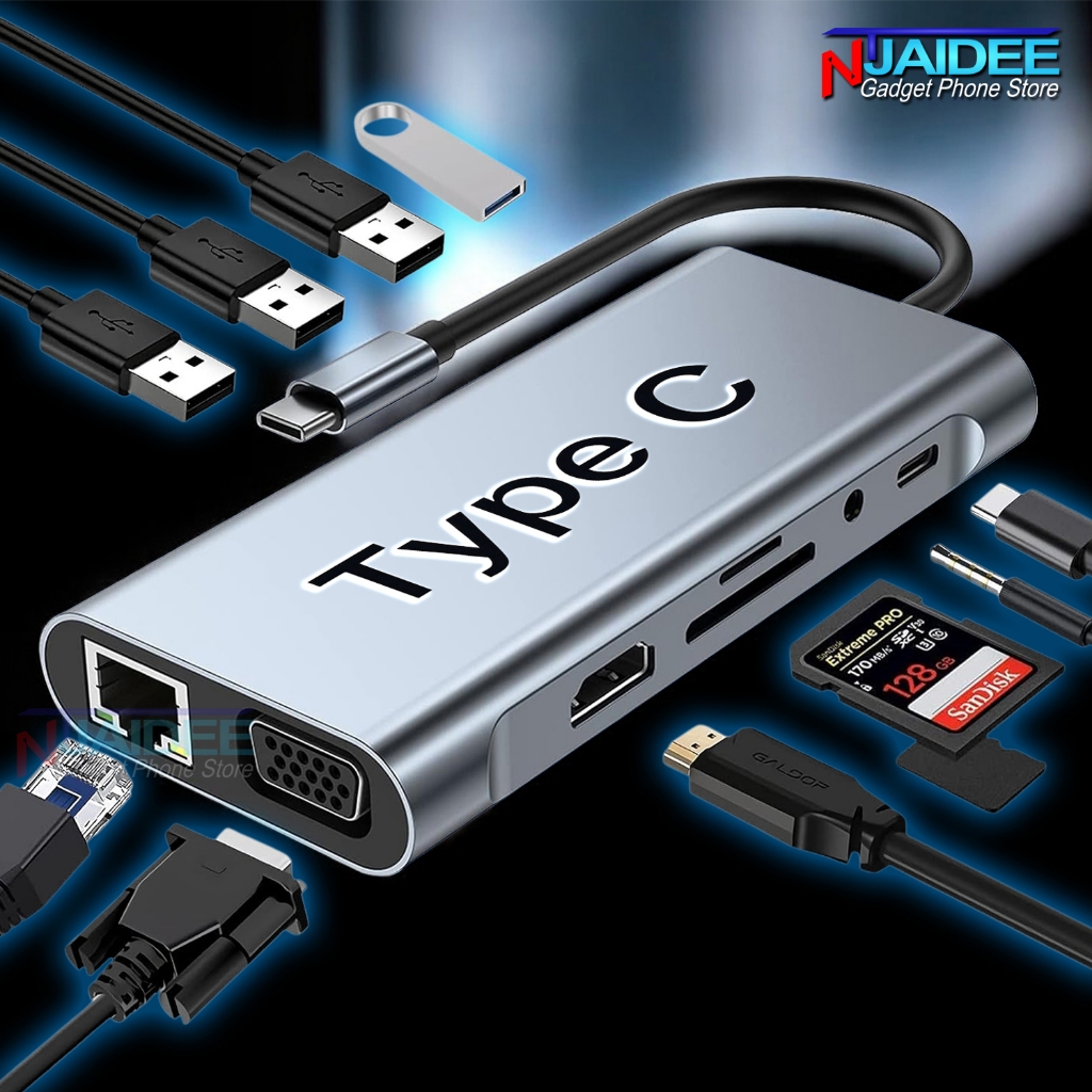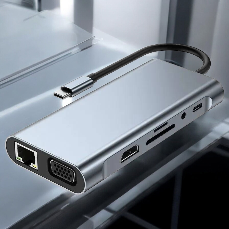 Type C Hub Adapter 11in1 Dongle with 4K HDMI VGA, Type C PD, USB3.0 RJ45 Ethernet SD/TF Card Reader