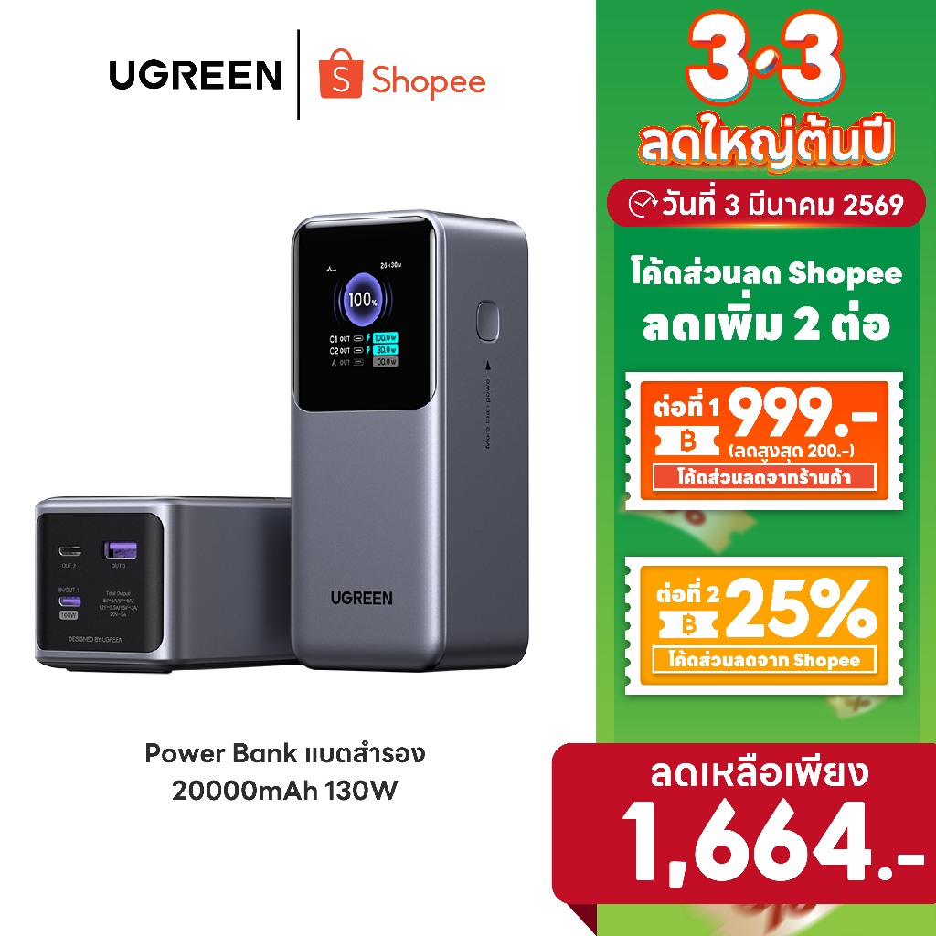 [ลดเหลือ 1664] UGREEN Power Bank แบตสำรอง 20000mAh 2C1A 130W Super Fast Charging สําหรับ Macbook/IPhone รุ่น 35524B