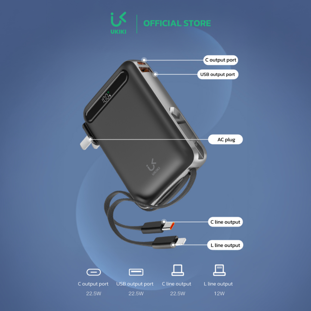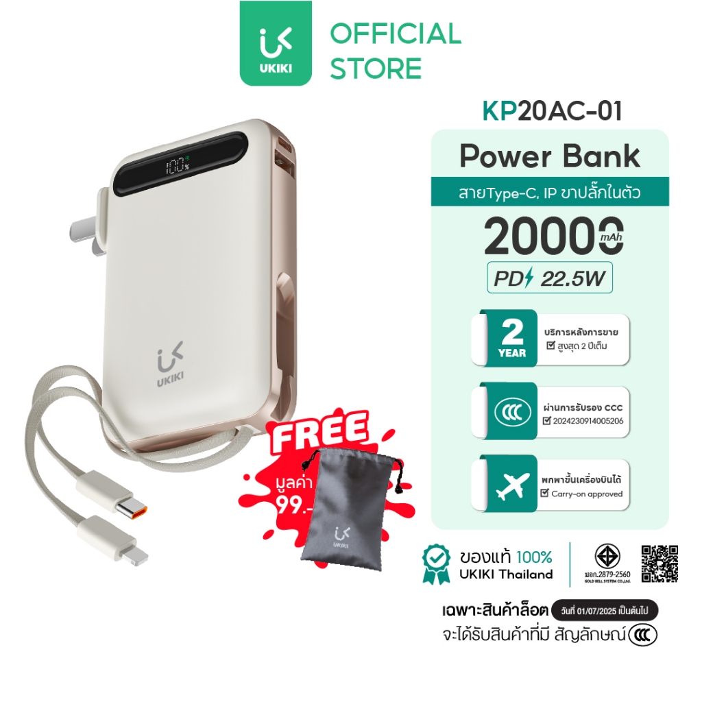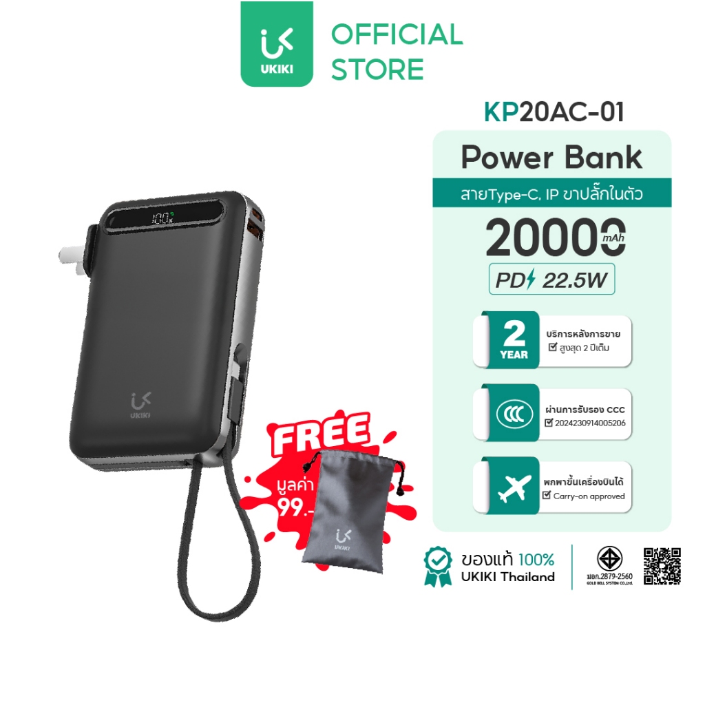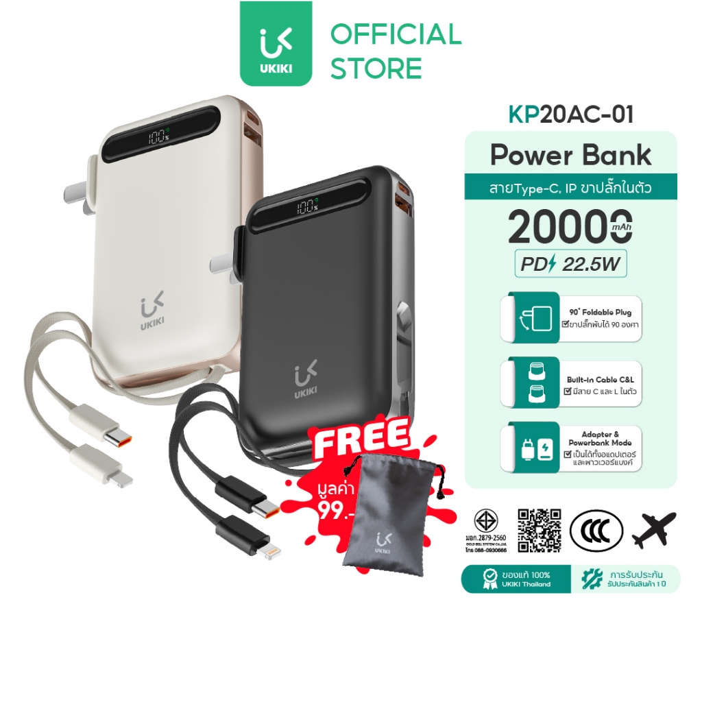 [แถมถุงผ้า] UKIKI Powerbank 20000mAh Fast Charge PD22.5W พาวเวอร์แบงค์ชาร์จเร็ว แบตสำรอง KP20AC-01