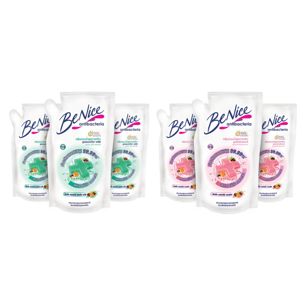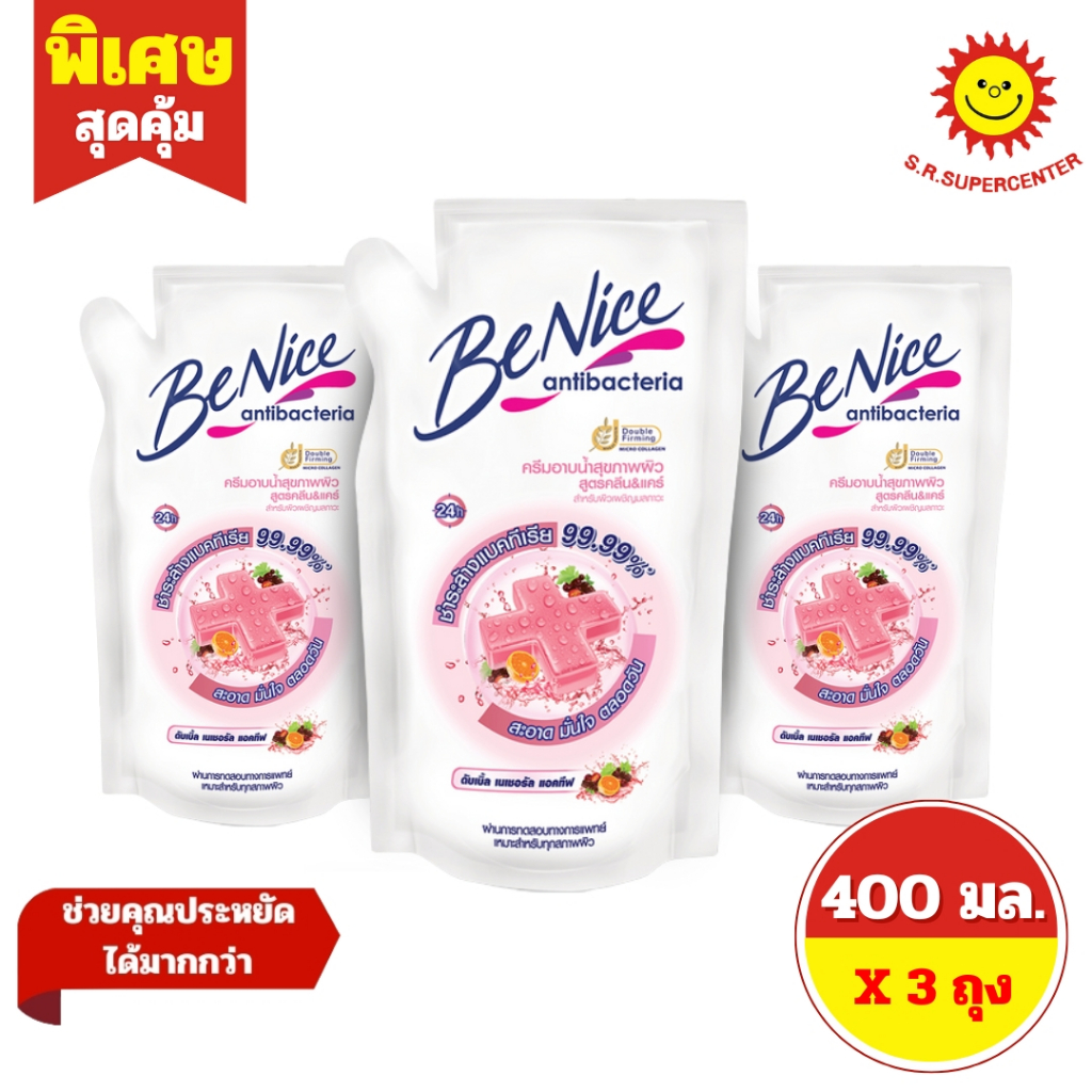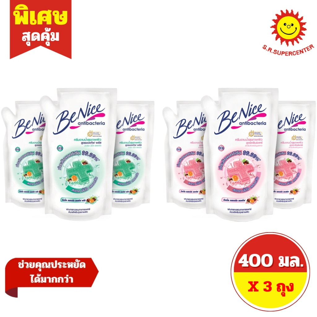 [ 3 ถุง ] BeNice บีไนซ์ ครีมอาบน้ำสุขภาพผิว ชำระล้างแบคทีเรีย 99.99% ขนาด 400 มล. x 3 ถุง 2 สูตร
