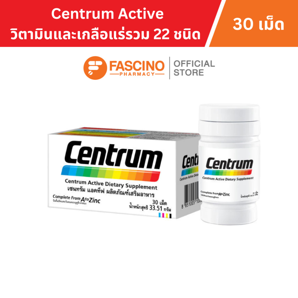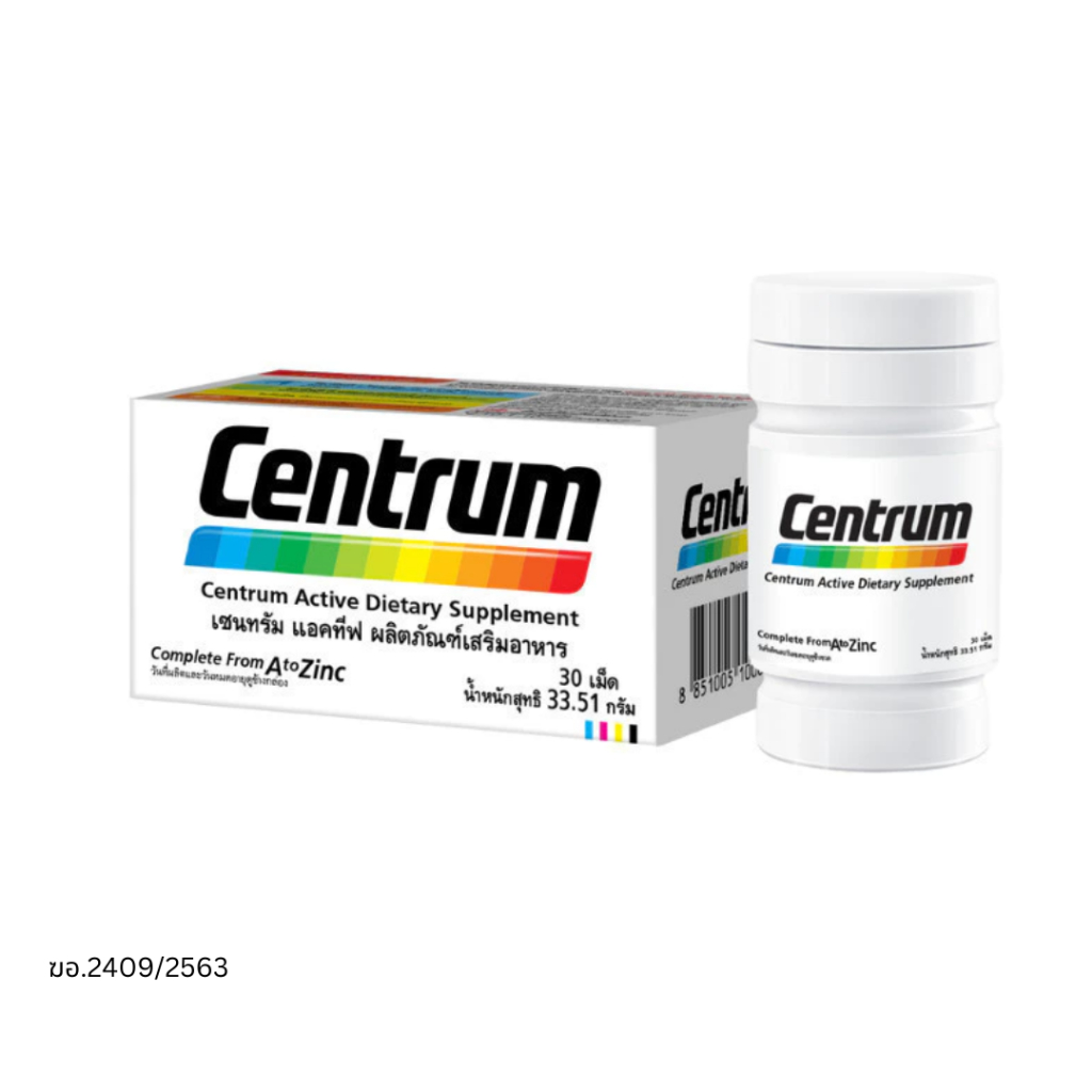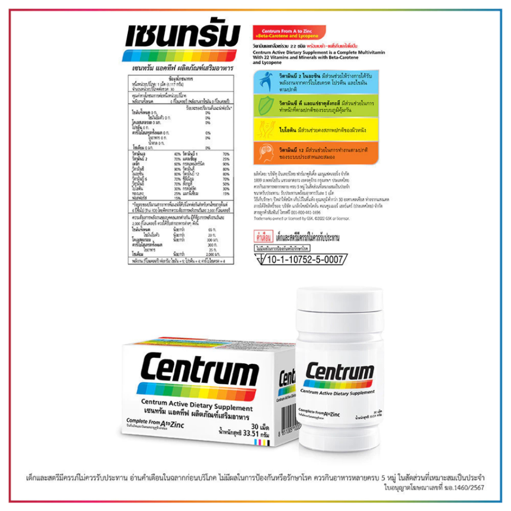 Centrum Active เซนทรัม วิตามินและเกลือแร่รวม 22 ชนิด (30 เม็ด) –วิตามินรวม, ใส่ใจร่างกายองค์รวม