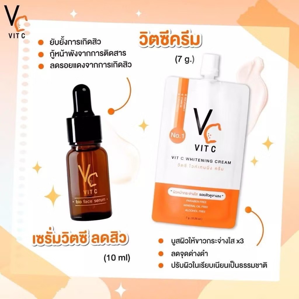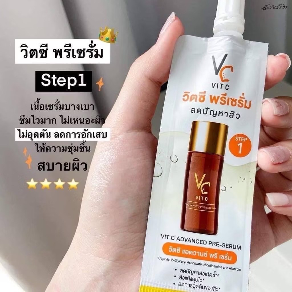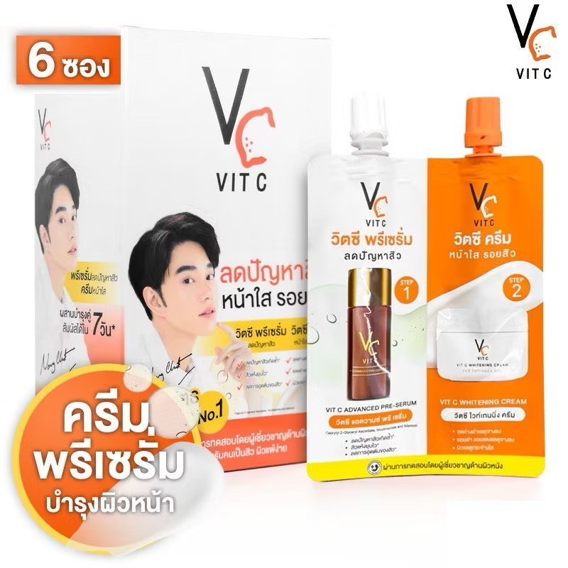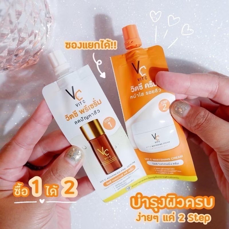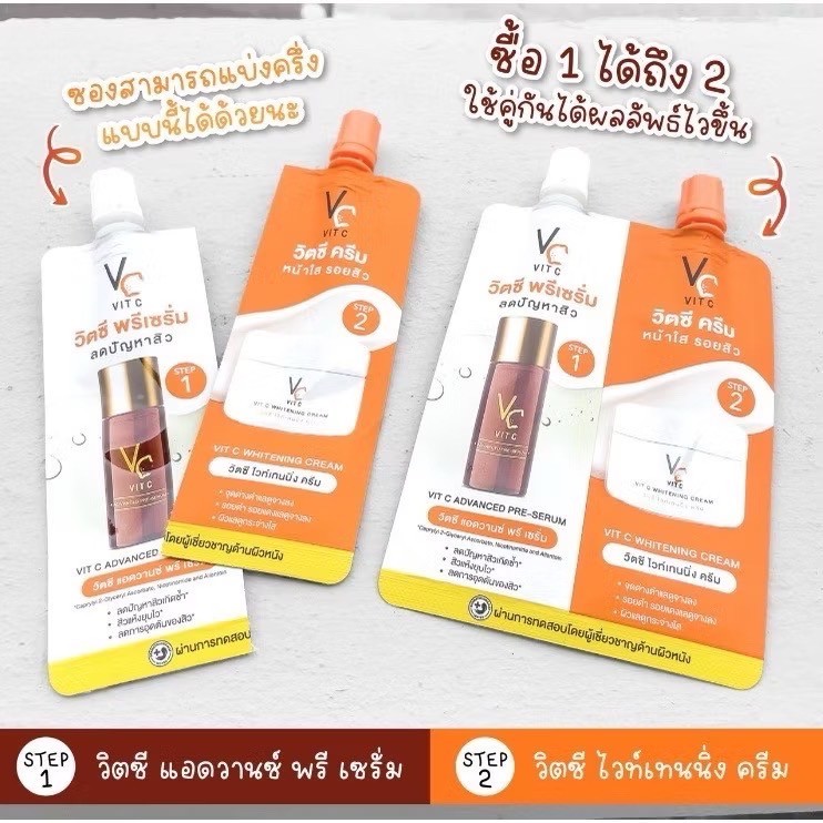 Double Vit C วิตซีน้องฉัตร ดับเบิ้ลวิตซี ครีม เซรั่ม 2 สเต็ป วิตซีซองคู่ Vit C Advance Pre Serum & Whitening Cream 4+4 g