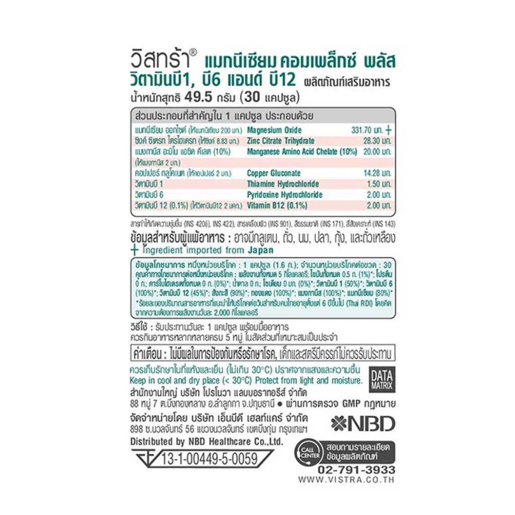 VISTRA Magnesium Complex 30แคปซูล 83003 วิสทร้า แมกนีเซียม คอมเพล็กซ์ พลัส วิตามินบี 1, บี 6 แอนด์ บี 12