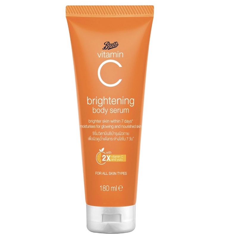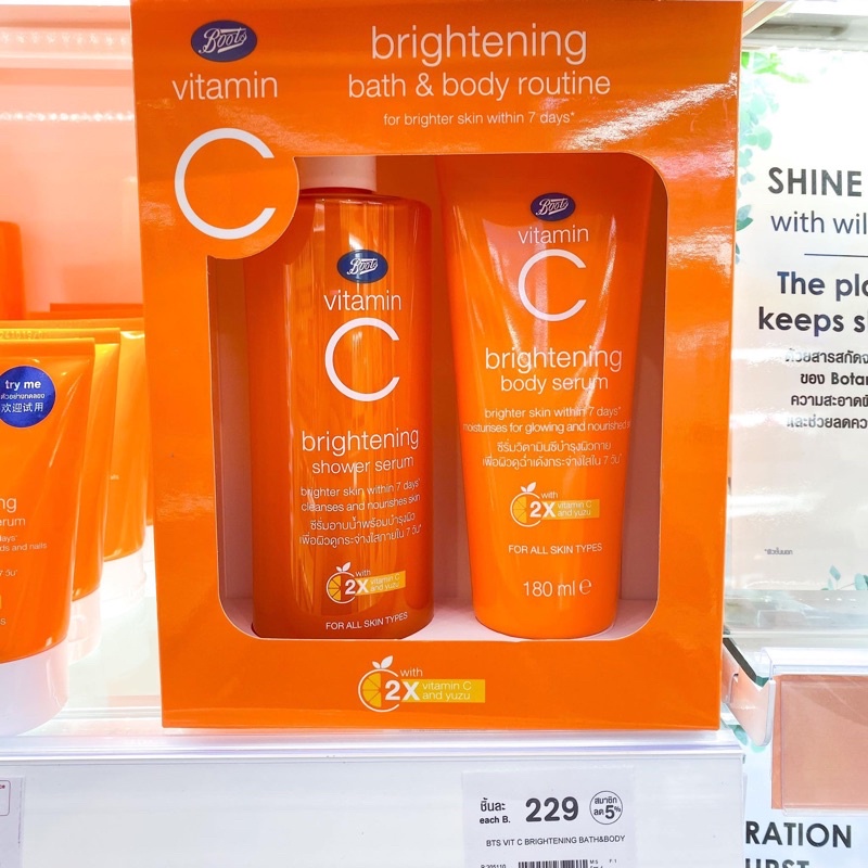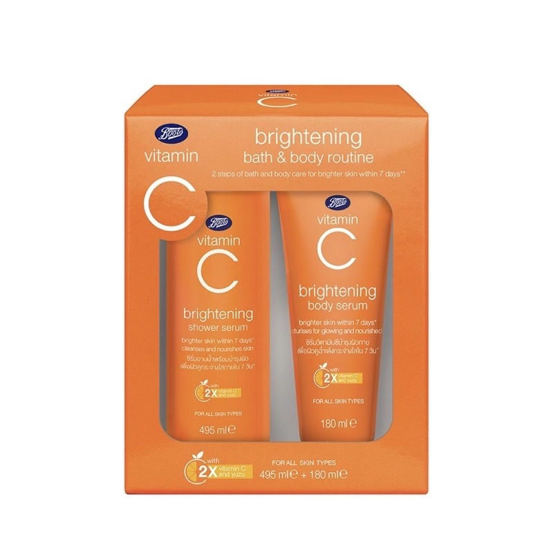 BOOTS VITAMIN C บู๊ทส์ วิตามิน ซี ไบรท์เทนนิ่ง บาธ แอนด์ บอดี้ รูทีน x 2 ชิ้น (495มล+180มล)