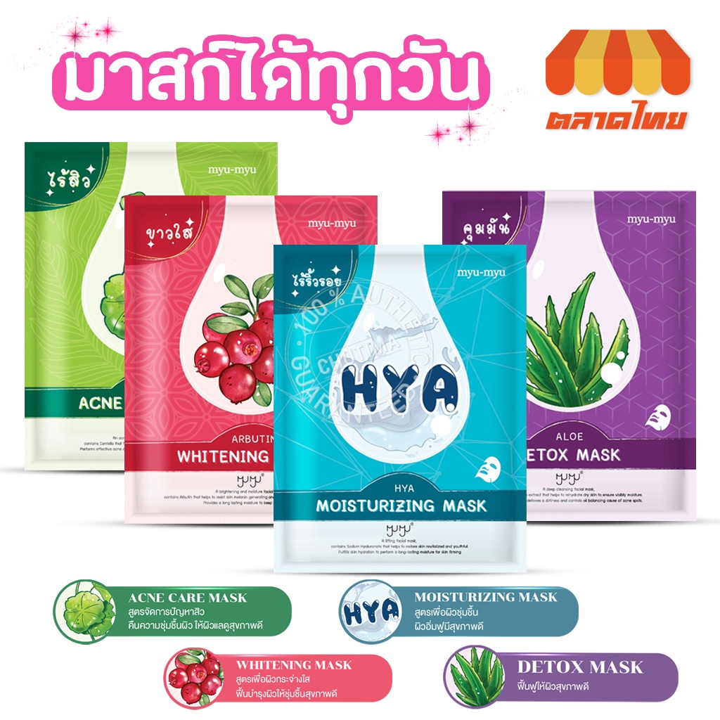 มาส์กหน้า มิว มิว 4 สูตร ขาวใส / ไร้สิว / ไร้ริ้วรอย / คุมมัน MYU-MYU Mask Hya / Centella / Aloe / Arbutin