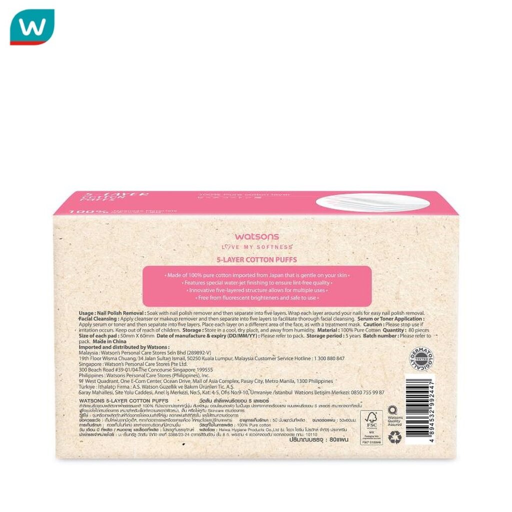 Watsons วัตสัน สำลีแผ่นรีดขอบ 5 เลเยอร์ 80 แผ่น.