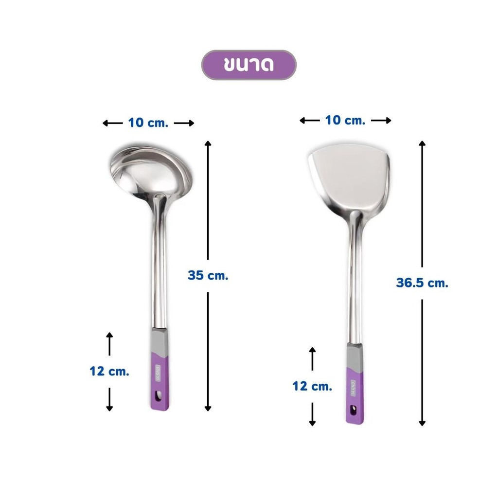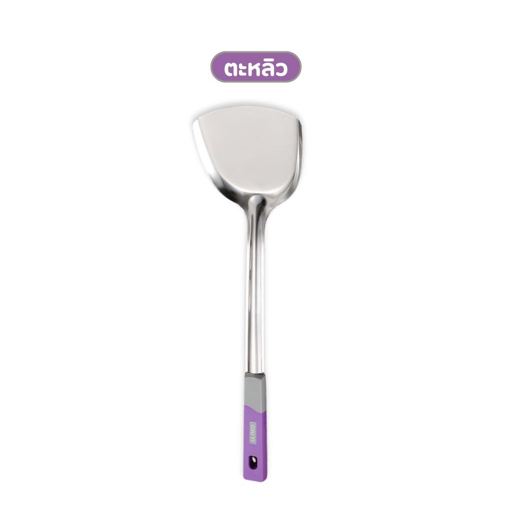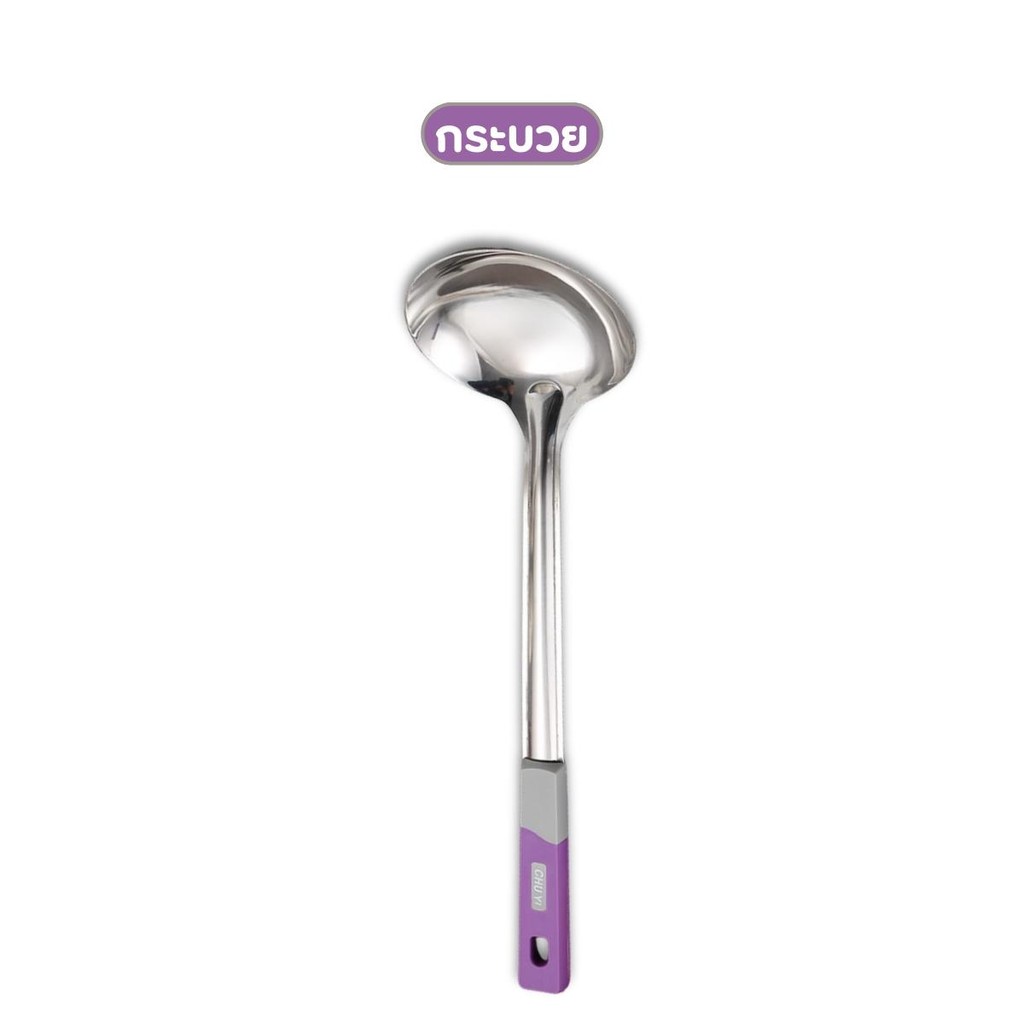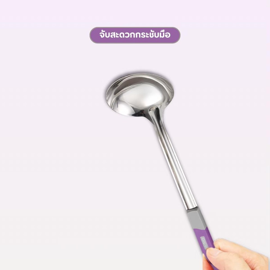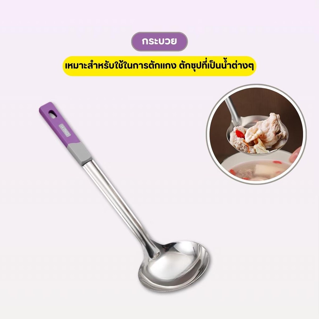 กระบวยสแตนเลส ตะหลิวสแตนเลส ด้ามพลาสติกสีม่วง