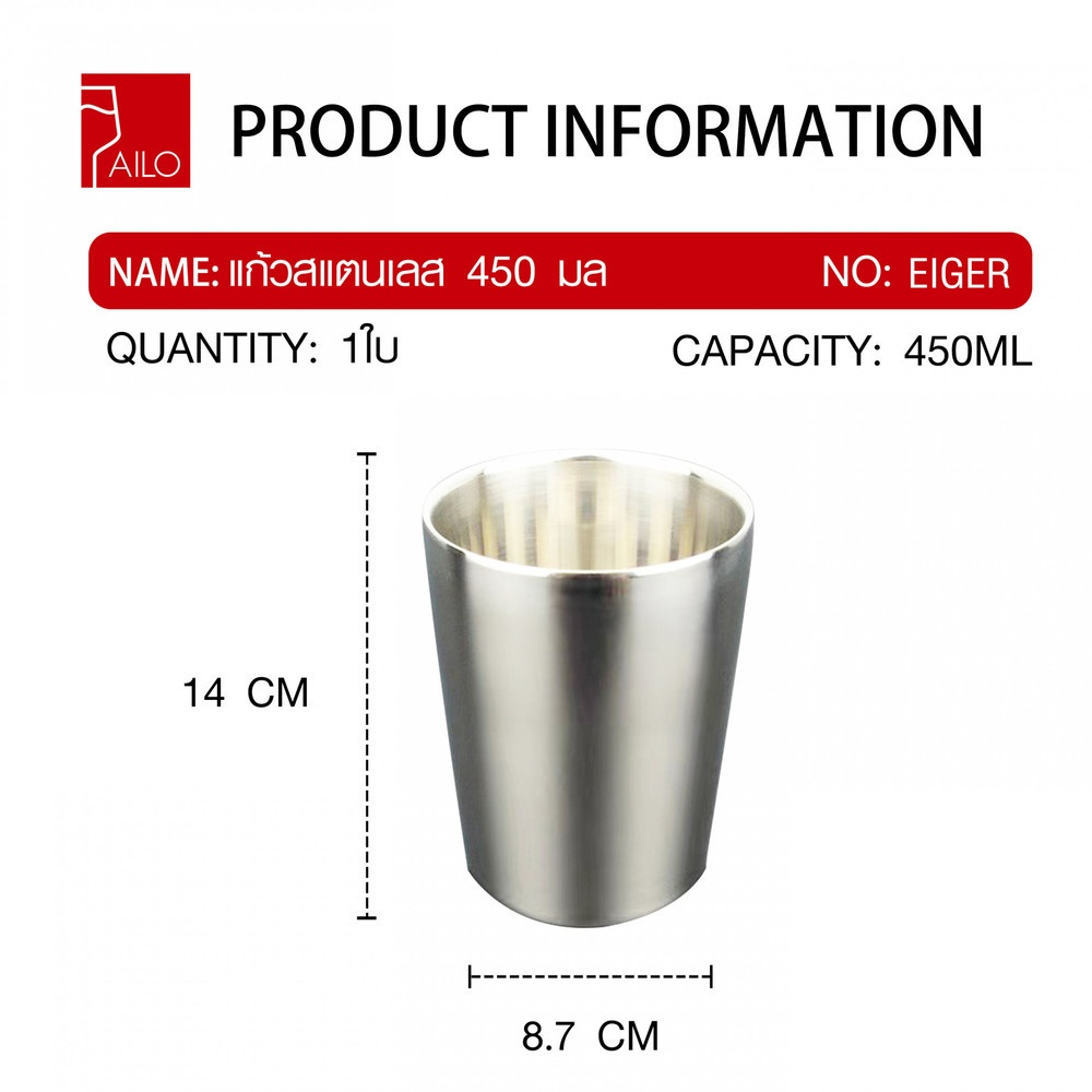 GlobalHouse AILO แก้วสแตนเลส 2 ชั้น 450 มล. EIGER สีเงิน สินค้าของแท้คุณภาพดี