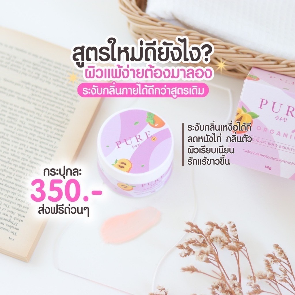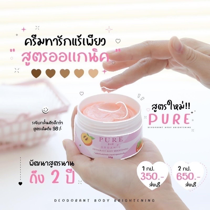 ครีมเพียว (กระปุกชมพู) สูตรออร์แกนิค ของแท้100% PURE Skin Care Deodorant Body Cream สูตรใหม่ อ่อนโยน ครีมทารักแร้ 50g