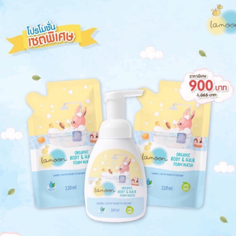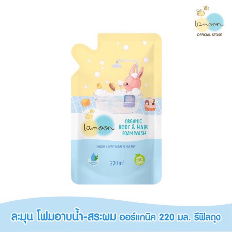 Lamoon โฟมอาบน้ำ & สระผม 2 in 1 ยกเซท 1 ขวดปั๊มและรีฟิล 2 ถุง
