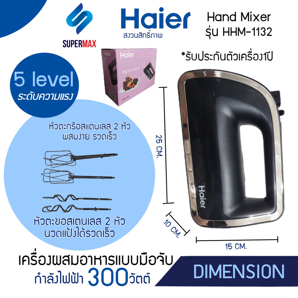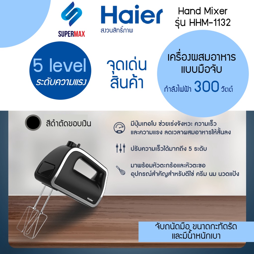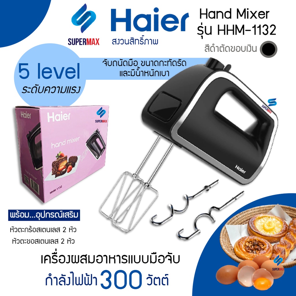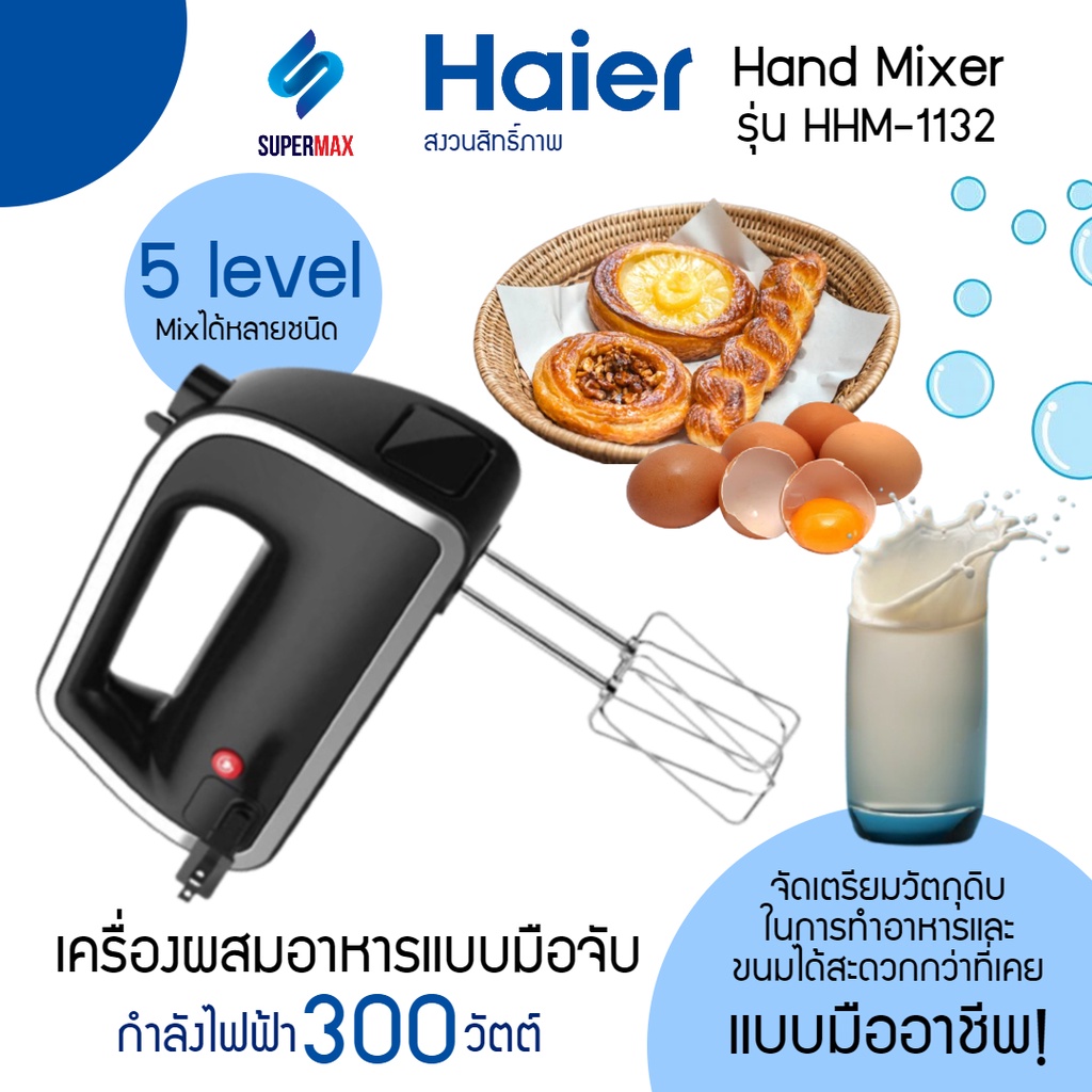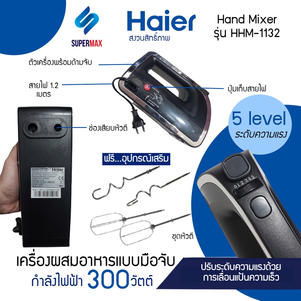 HAIER Hand Mixerเครื่องผสมอาหารมือถือ กำลังไฟ 300 W รุ่น HHM-1132 รับประกันสินค้า 1ปี จัดเก็บจัดเก็บสายไฟอัตโนมัติ เพีย