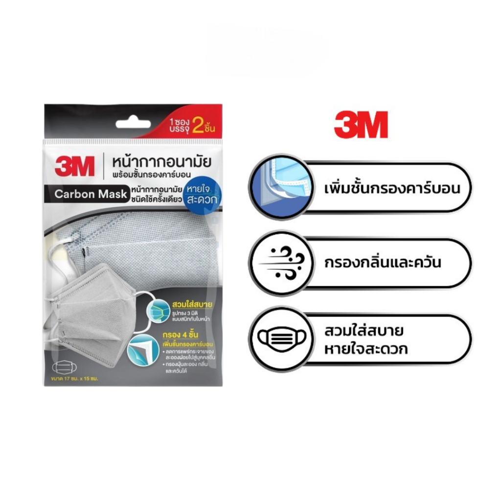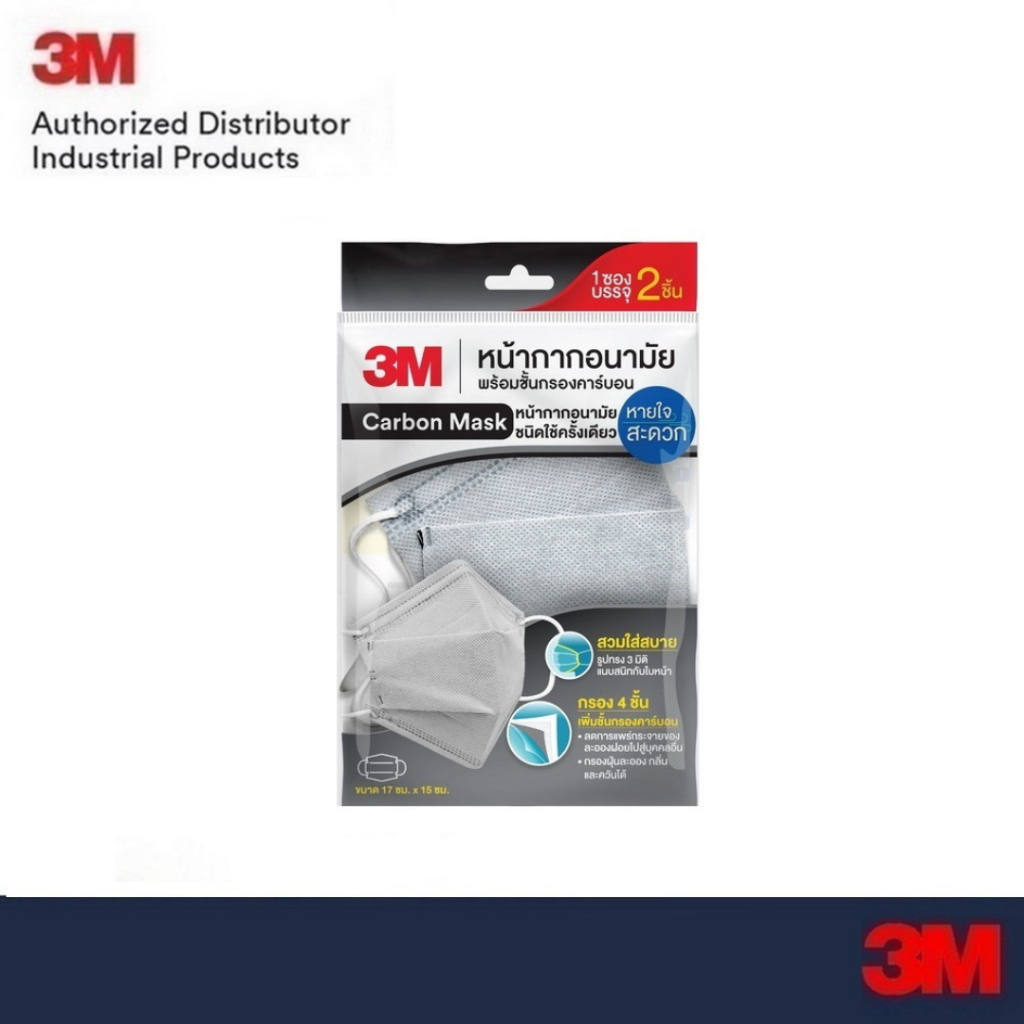 หน้ากาก อนามัย 3M Carbon Mask - ทรง 3D พร้อมชั้นกรอง คาร์บอน, กรองฝุ่น กลิ่นและควัน แมส, 2 ชิ้น / 1ซอง