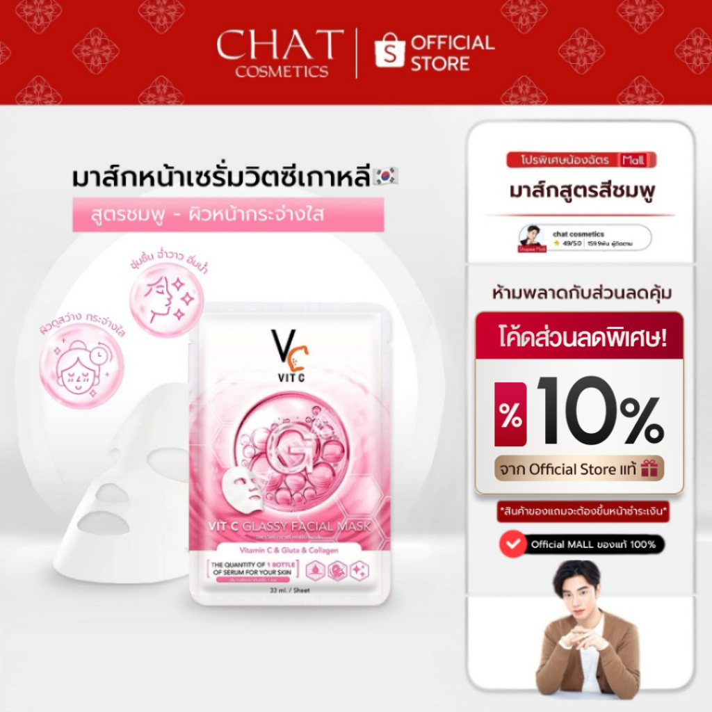 [ส่งด่วน] มาส์กหน้าวิตซี สูตรกระจ่างใส สีชมพู VITC GLASSY FACIAL MASK ( แบบซอง)