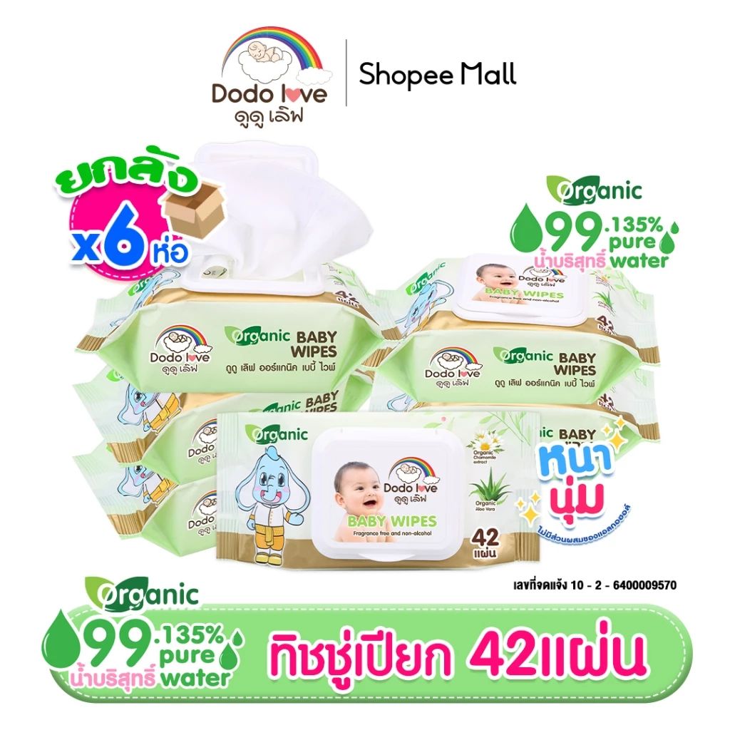 🧴 DODOLOVE Baby Wipes ผ้าเช็ดทำความสะอาดเด็ก สูตรออร์แกนิค 6 แพ็ค