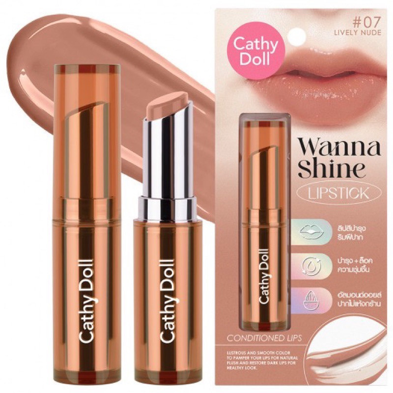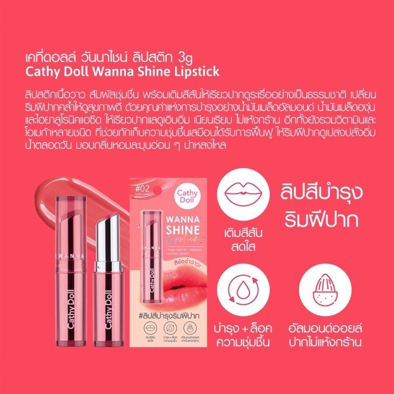 [1 แท่ง] Cathy Doll Wanna Shine Lipstick เคที่ดอลล์ วันนาไชน์ ลิปสติก ลิปสีบำรุงริมฝีปาก ลิปสติกเนื้อวาว