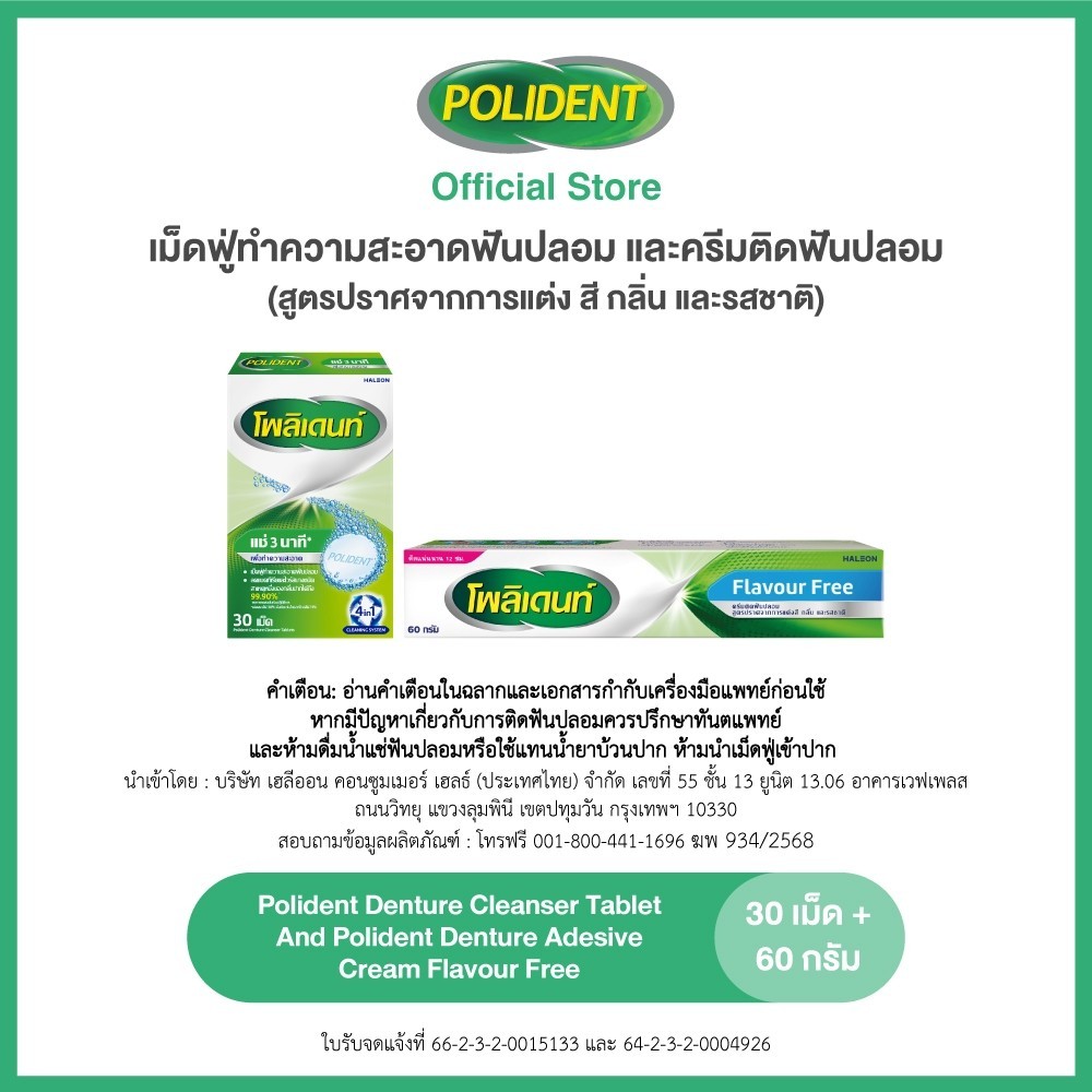 POLIDENT SET BUNDLE CLEANSER 30'S+FLAVOR FREE CREAM 60G โพลิเดนท์ เม็ดฟู่ทำความสะอาดฟันปลอม 30เม็ด&ครีมติดฟันปลอม 60กรัม
