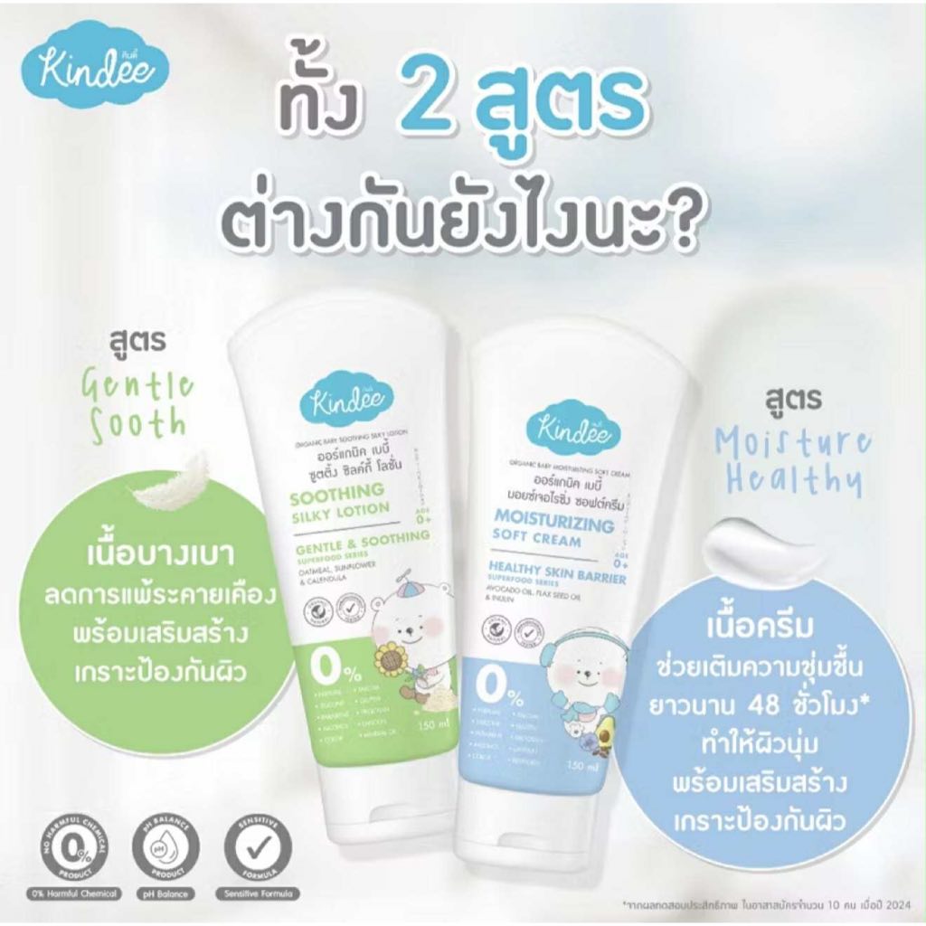 (ส่งด่วน/ส่งทันที🔥) Kindee คินดี้ เบบี้ โลชั่นซุปเปอร์ฟู้ด สูตรซูตติ้ง ซิลค์กี้ และสูตรมอยซ์เจอไรซิ่ง ซอฟต์ครีม (150มล.)