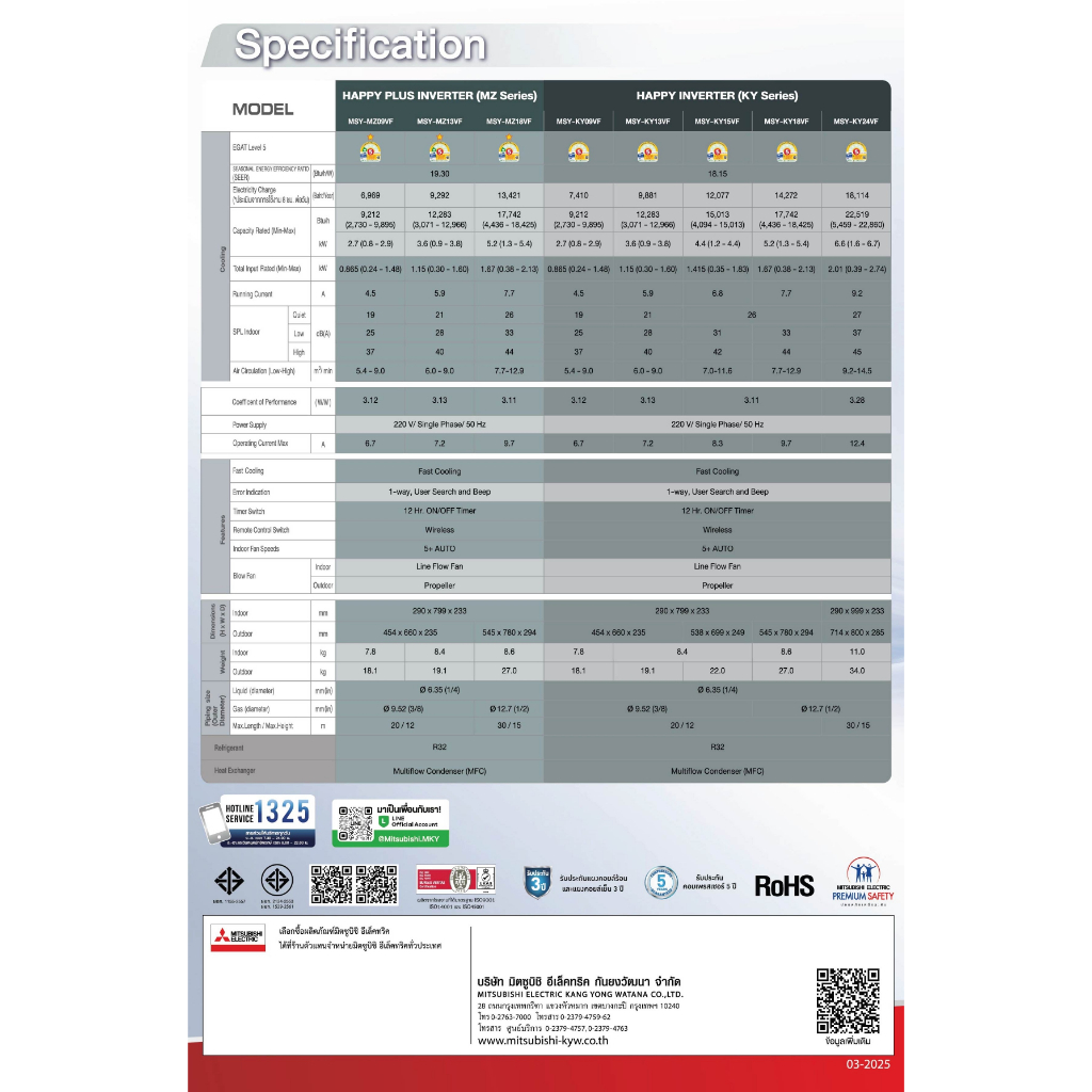 Mitsubishi แอร์มิตซูบิชิ KZ Series Happy inverter รุ่น MSY-KZ13VF อินเวอร์เตอร์ ขนาด 12,283 BTU