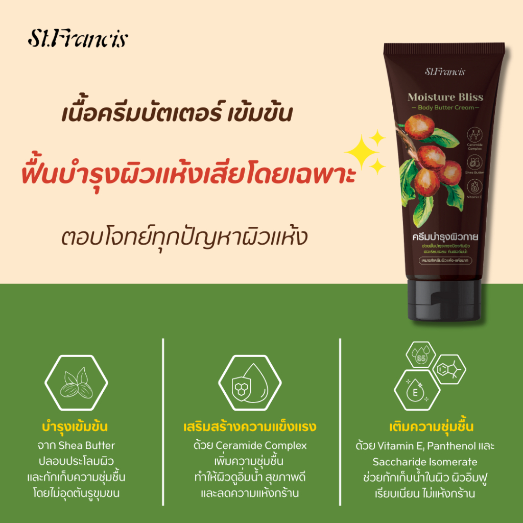 ST.FRANCIS ครีมทาผิว BODY BUTTER CREAM 150g. เนื้อบัตเตอร์ เข้มข้น ซึมง่าย ฟื้นบำรุงผิวแห้งเสียโดยเฉพาะ