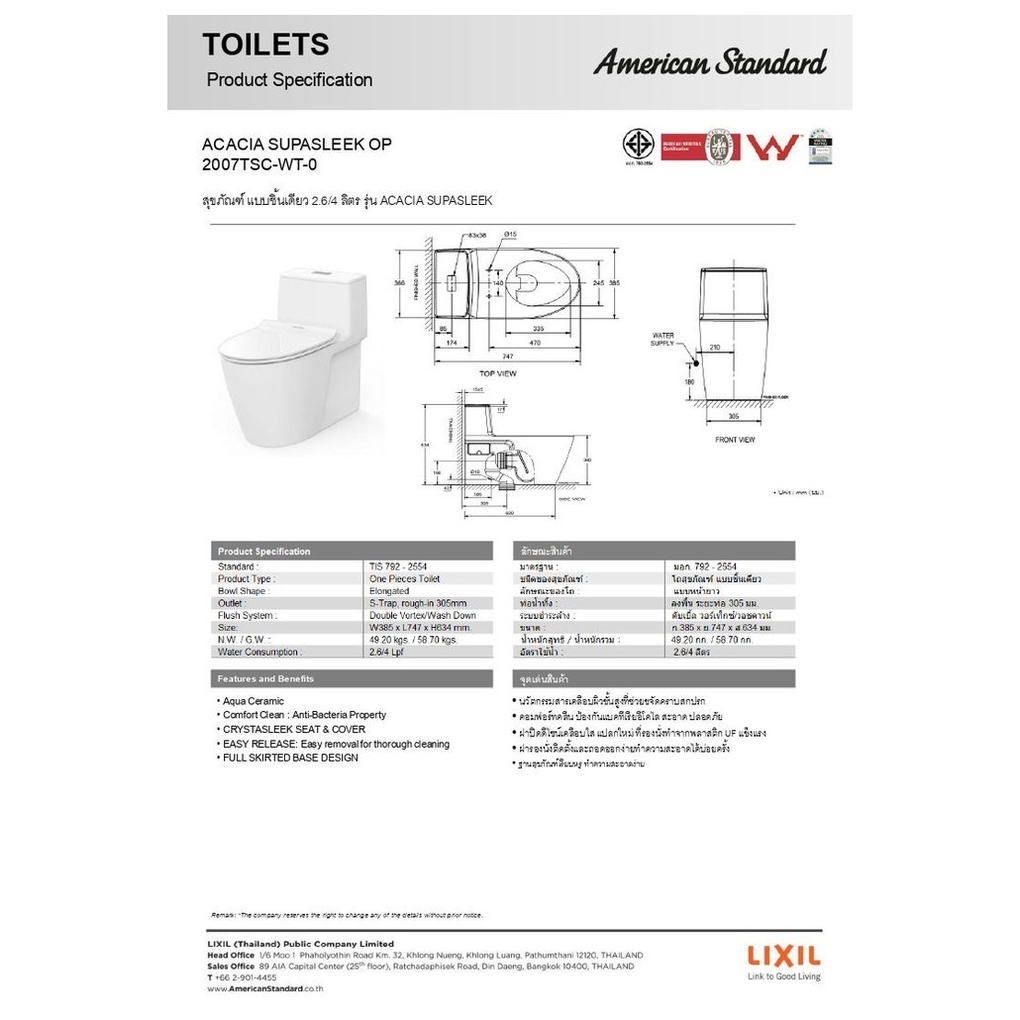 American Standard สุขภัณฑ์สองชิ้นแบบกดบน2 ระบบ 2.6/4L รุ่น อะคาเซีย ซูป้าสลีค 2007TSC-WT-0 ขนาด สีขาว