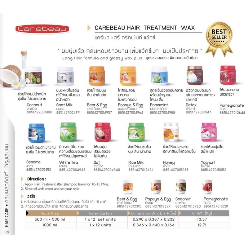 Carebeau hair treatment wax แคร์บิว แฮร์ ทรีทเม้นท์ แว็กซ์ หมักผม 500 ml+500ml.(แพ็คคู่)