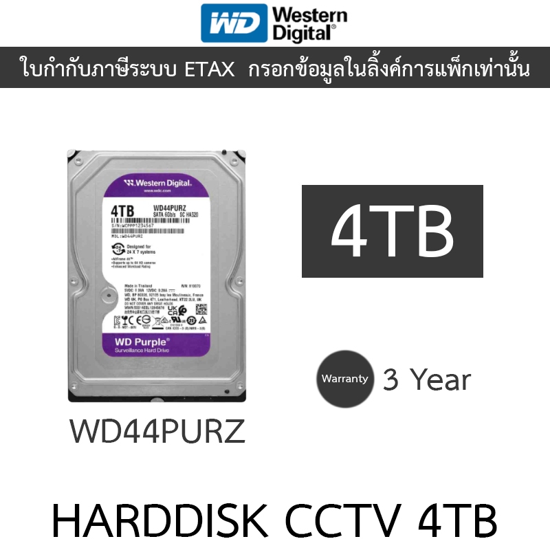 WD 4TB Purple Harddisk for CCTV ฮาร์ดดิสสำหรับกล้องวงจรปิด - WD44PURZ