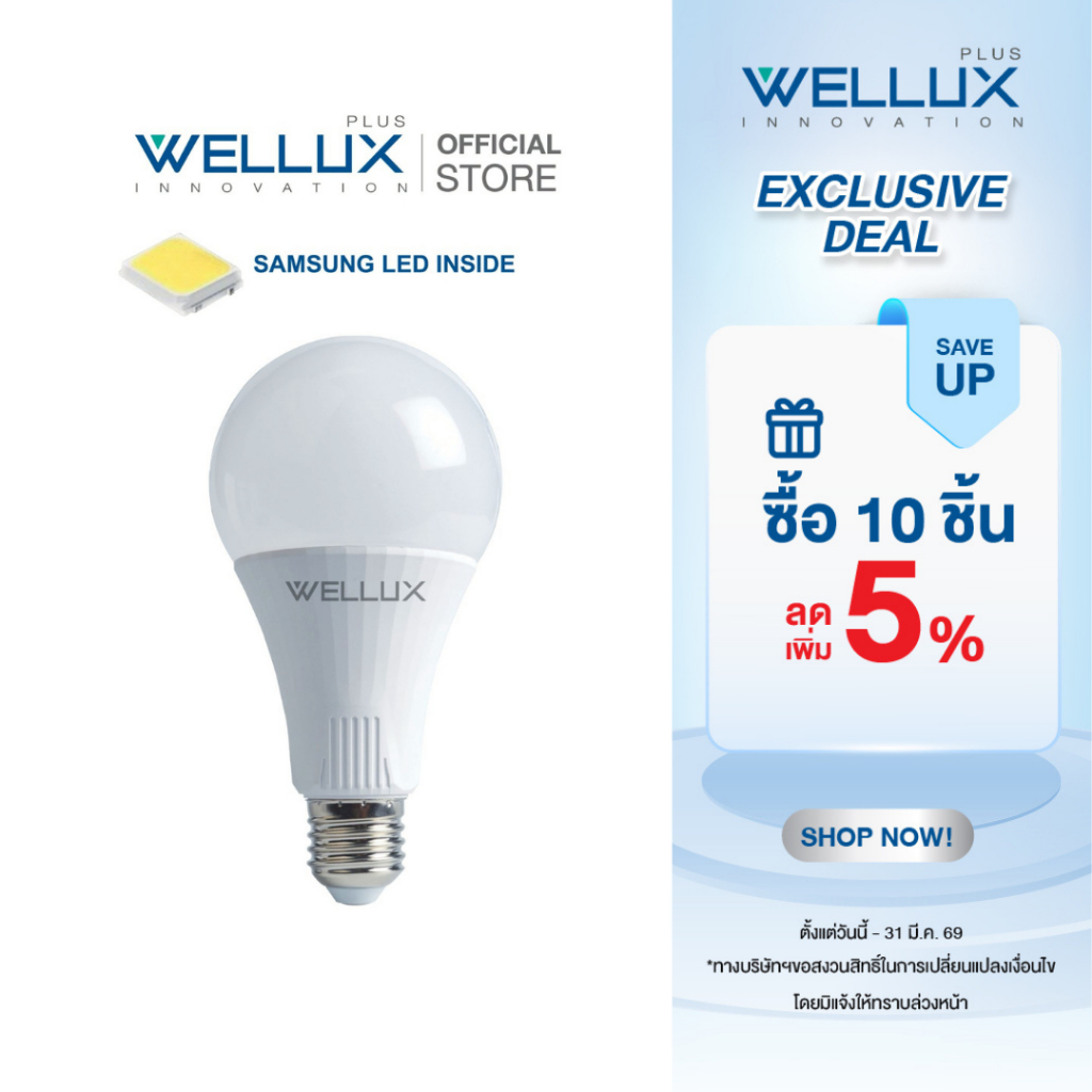 WELLUX หลอดไฟชิปซัมซุง 5W 7W 9W 15W 20W 25W คุณภาพสูง CHIP SUMSUNG LED BULB ขั้วE27