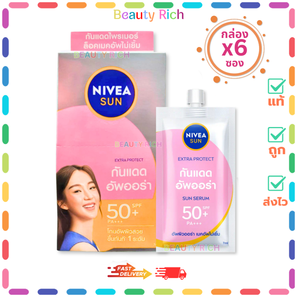 (กล่อง 6 ซอง) Nivea Sun Extra Protect Serum (สีชมพู) เซรั่มกันแดด ผิวหน้าอัพผิวออร่า (7 ml.)