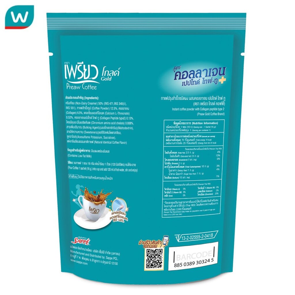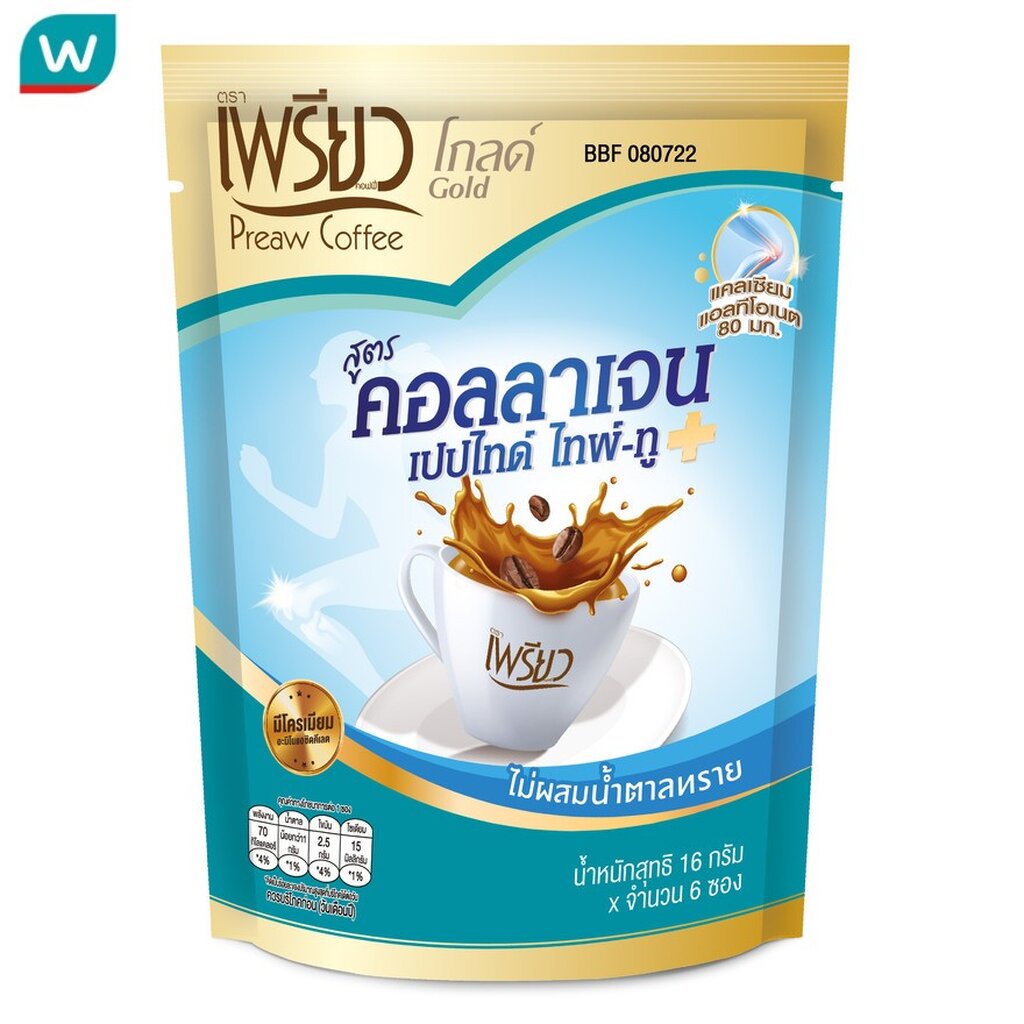 Preaw เพรียว อินสแตนท์ คอฟฟี่ สูตรคอลลาเจน ไทป์2 6ชิ้น (ไม่มีน้ำตาล)