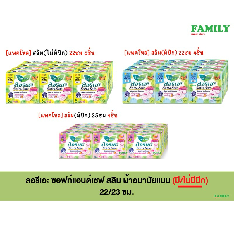 (แพคโหล) ลอรีเอะ soft&safe slim ผ้าอนามัย มี/ไม่มีปีก 22/23 ซม. 4/5 ชิ้น