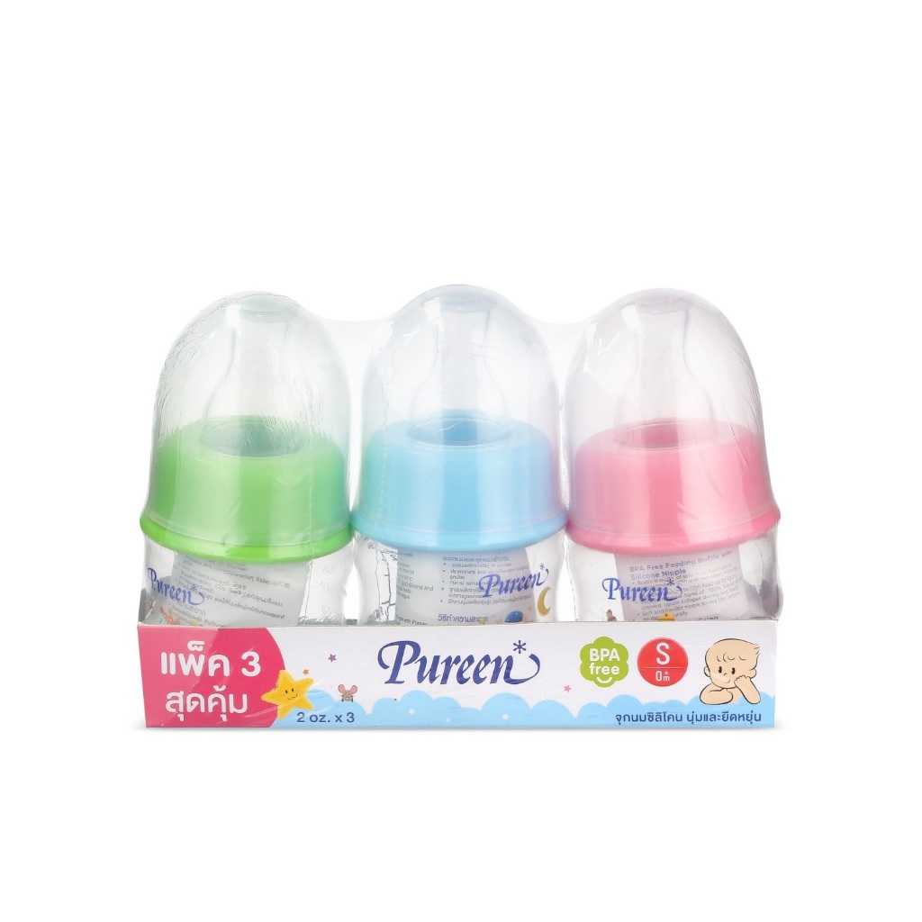 Pureen เพียวรีน ขวดนมพร้อมจุกนมซิลิโคน นุ่มและยืดหยุ่น (ฝาสี) ขนาด 2oz. จำนวน 3 ขวด ขนาด 4oz. / 8oz. จำนวน 6 ขวด