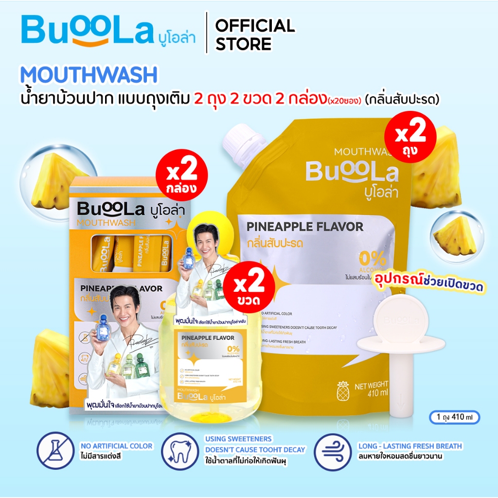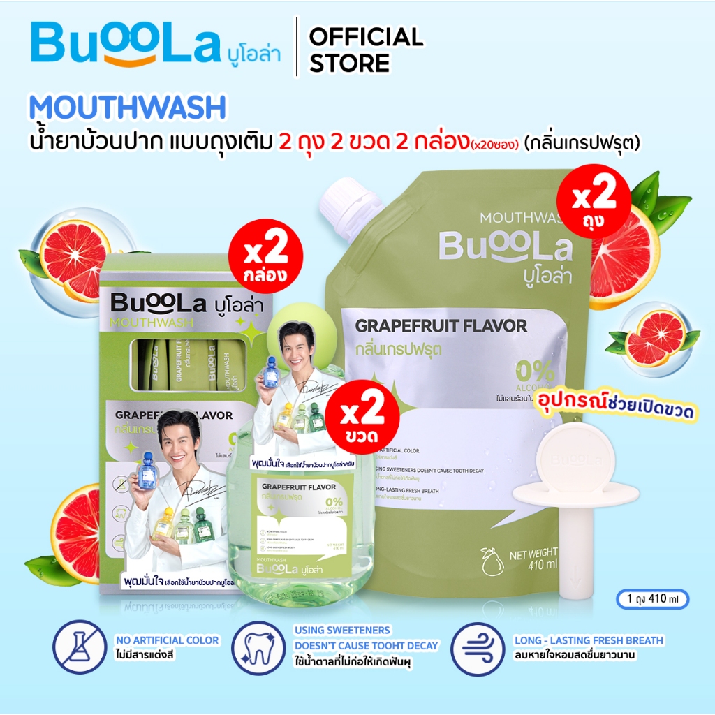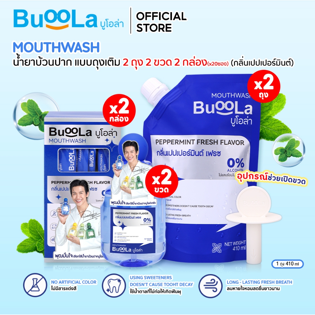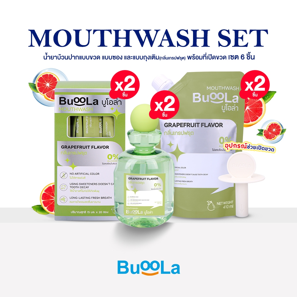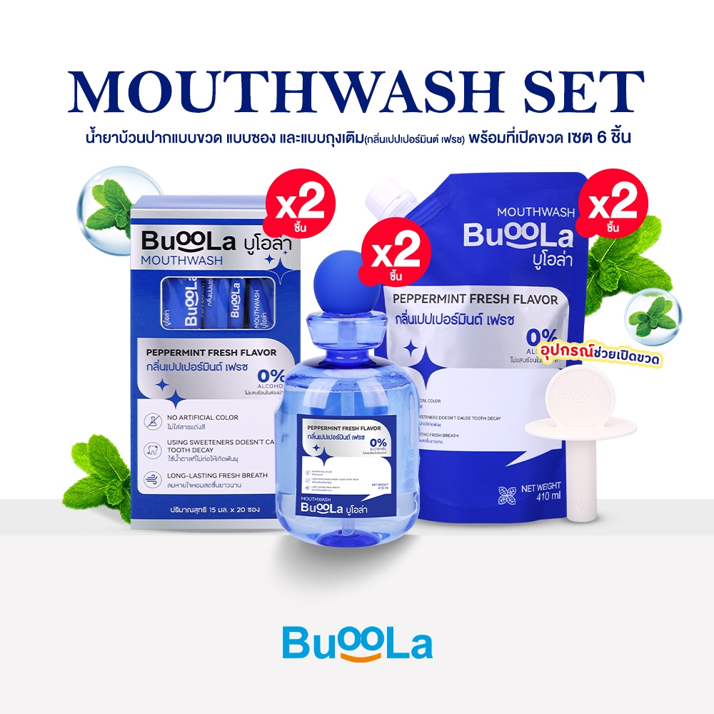 [เซต 6 ชิ้น] Buoola น ้ำยาบ้วนปาก 2 ขวด+ แบบพกพา 2 กล่อง + ถุงเติม 2 ถุง+ 1 ที่เปิดขวด ช่วยให้ปากหอม ลดกลิ่นปาก