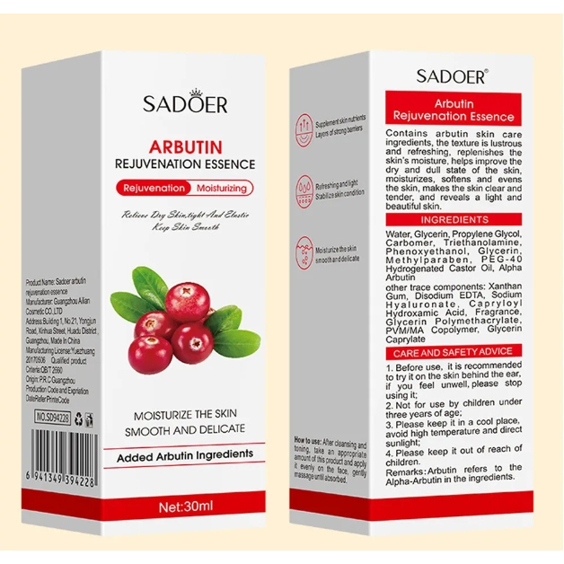 SADOER Arbutin Rejuvenation Essence เซรั่ม มีส่วนผสมของอาร์บูติน 30ml. กล่องขาวเชอร์รี่