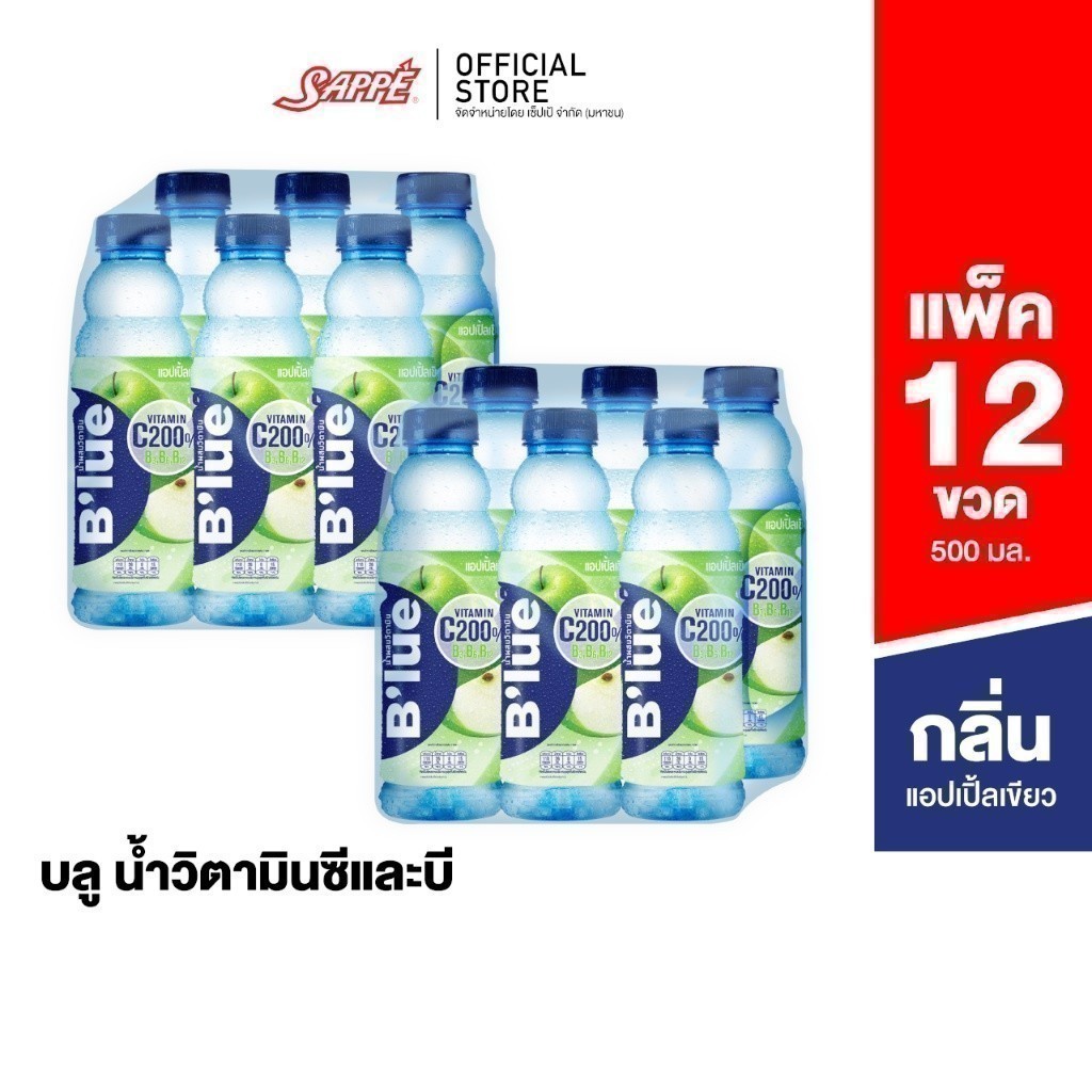 B'lue บลู น้ำผสมวิตามินซี 200% บี3 บี6 บี12 กลิ่นแอปเปิ้ลเขียว (Vitamin Water - Green Apple) 500ml. จำนวน 12 ขวด