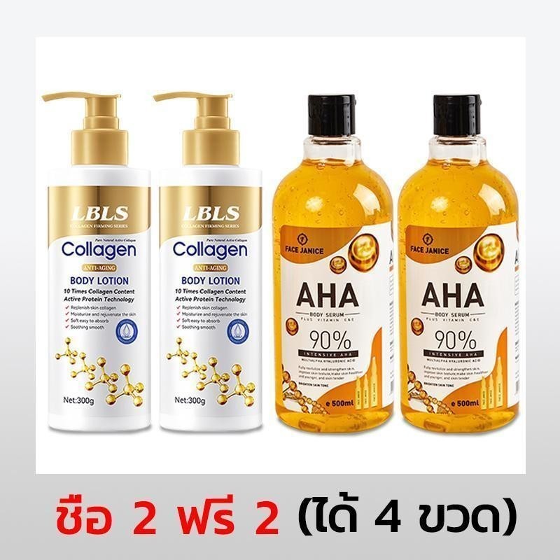 【2 แถม 2】AHA Body serum 90% Vitamin C สาระสำคัญ500ml + FACE JANICE โลชั่นคอลลาเจนทองคำ โลชั่นผิวขาว 300ml