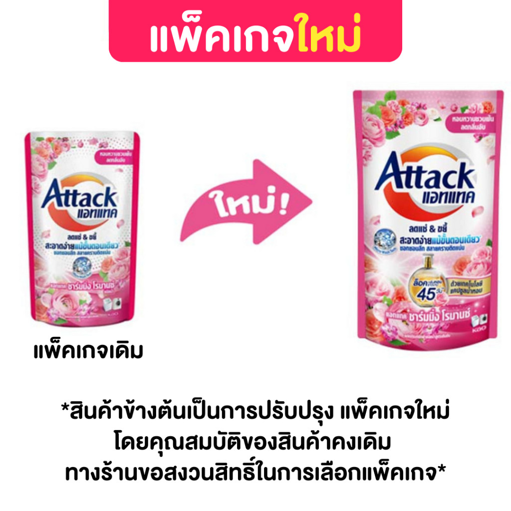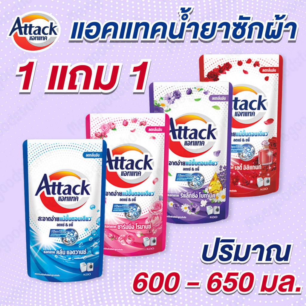 1 แถม 1 [ถุง] Attack น้ำยาซักผ้า แอทแทค ผลิตภัณฑ์ซักผ้าชนิดน้ำสูตรเข้มข้น มีให้เลือก 4 กลิ่น ปริมาณ 600 - 650 มล.