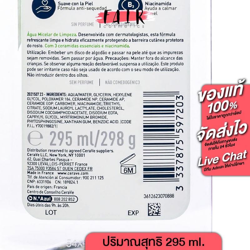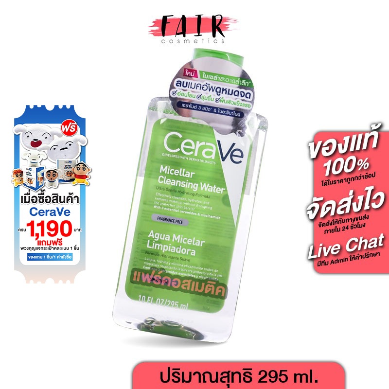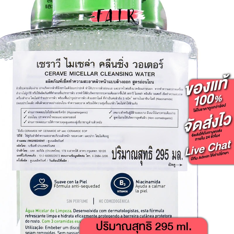 CeraVe Micellar Cleansing Water เซราวี ไมเซล่า คลีนซิ่ง วอเตอร์ [295 ml.] คลีนเซอร์ เช็ดทำความสะอาดผิวหน้า สูตรอ่อนโยน