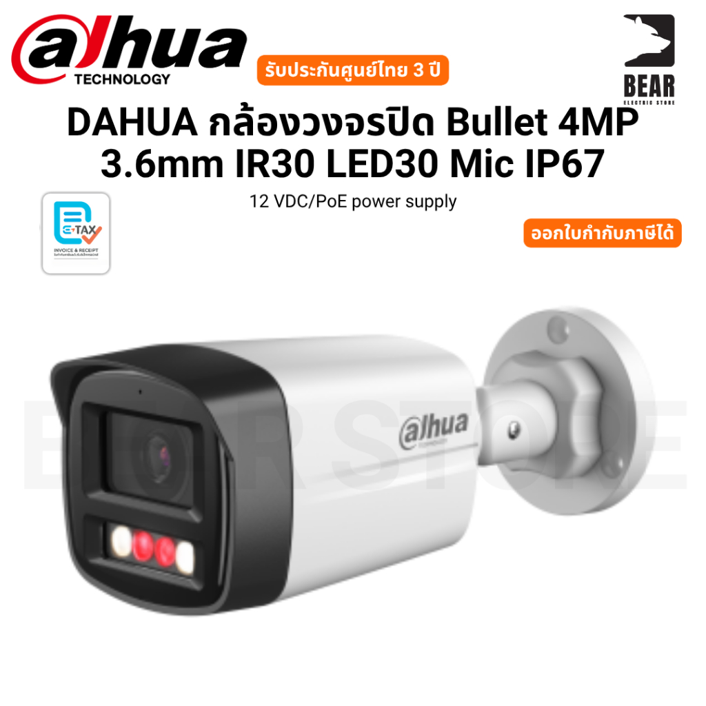 DAHUA กล้องวงจรปิด Bullet 4MP 3.6mm IR30 LED30 Mic IP67 12 VDC/PoE power supply รับประกันศูนย์ไทย 3 ปี