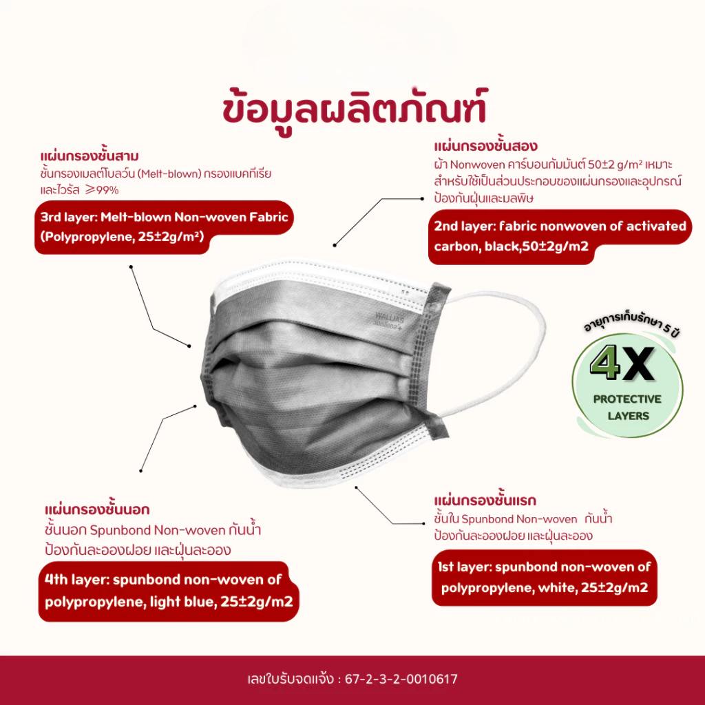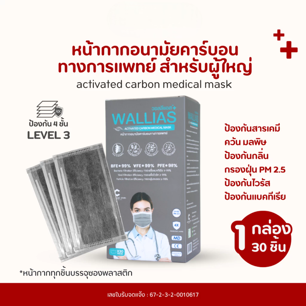 Wallias หน้ากากคาร์บอน 4 ชั้น กันฝุ่น/กลิ่น Activated Carbon Medical Mask แมสก์ผู้ใหญ่ 30 ชิ้น/กล่อง