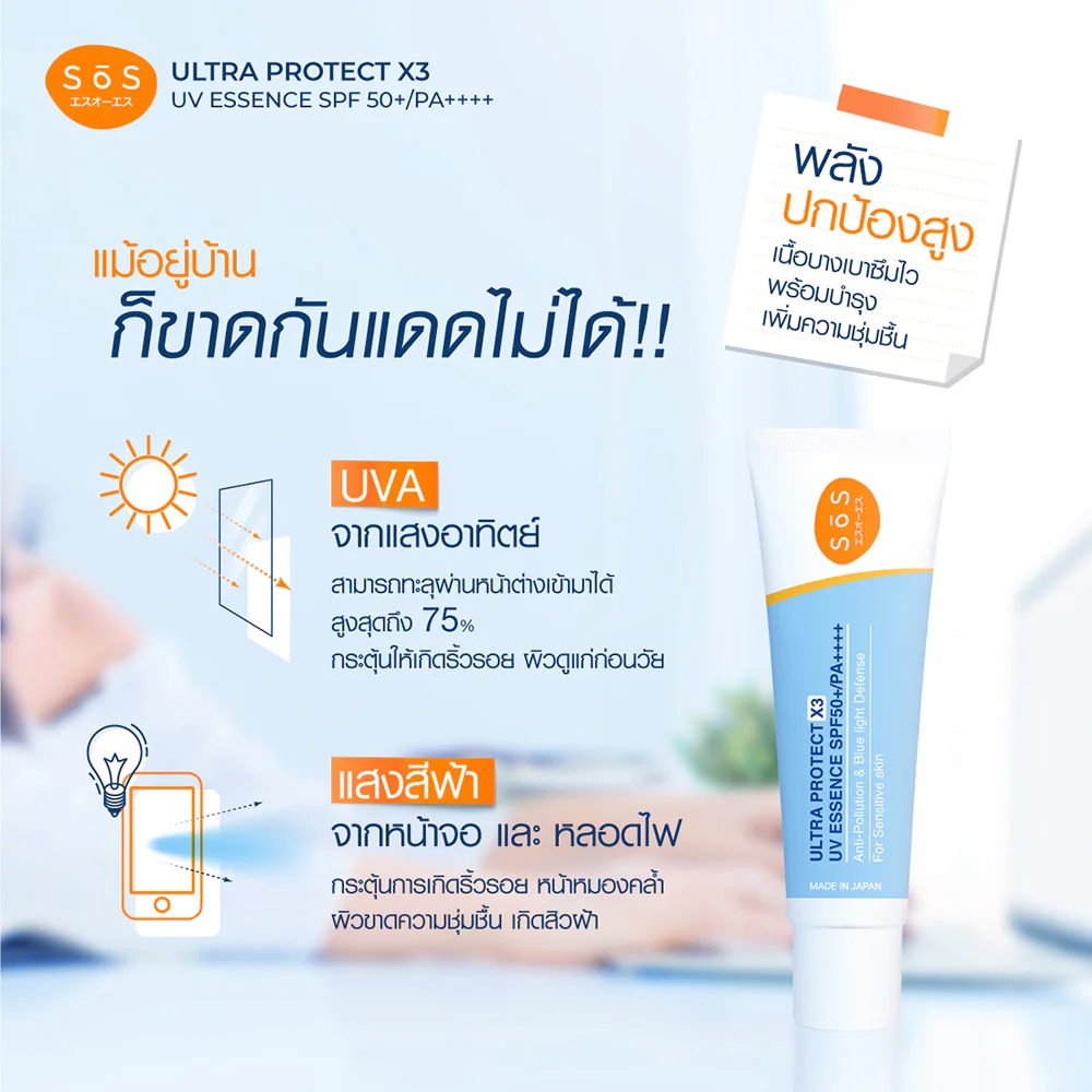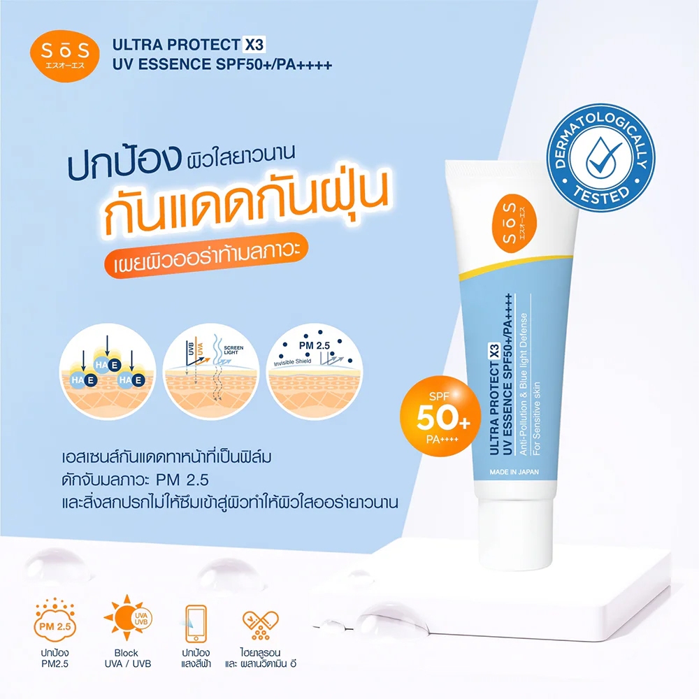 กันแดด เอะสึ โอ เอะสึ สูตรไฮยาลูรอน เนื้อเซรั่ม SOS Ultra Protect X3 UV Essence SPF50+ PA++++ 30 ml.