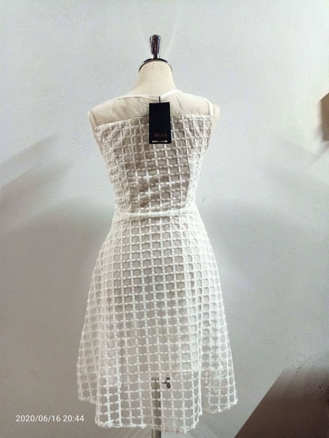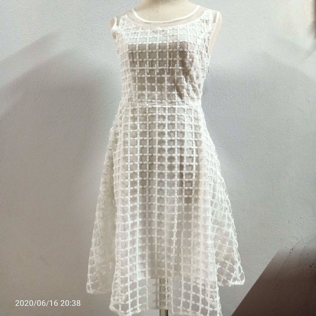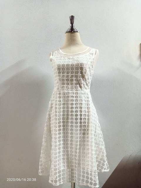 เดรสสั้น แขนกุด สีขาว ผ้าแก้วลาย ตาราง มือ 1 งานป้ายนำเข้า มีซัปใน
