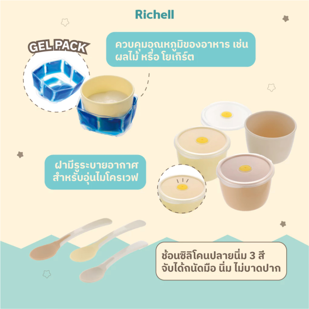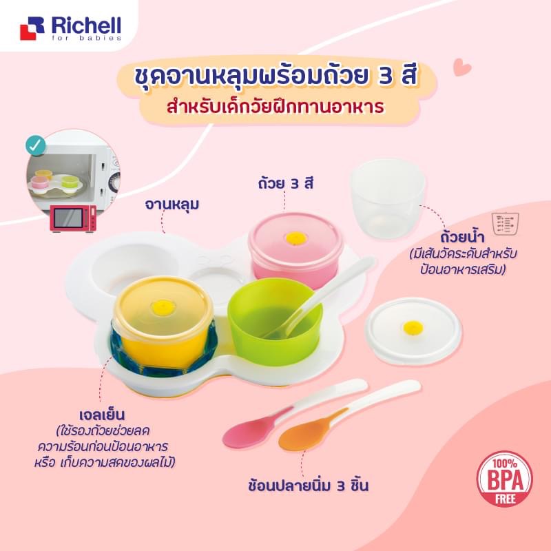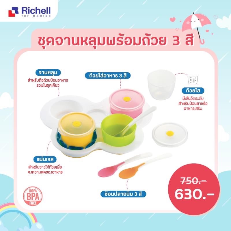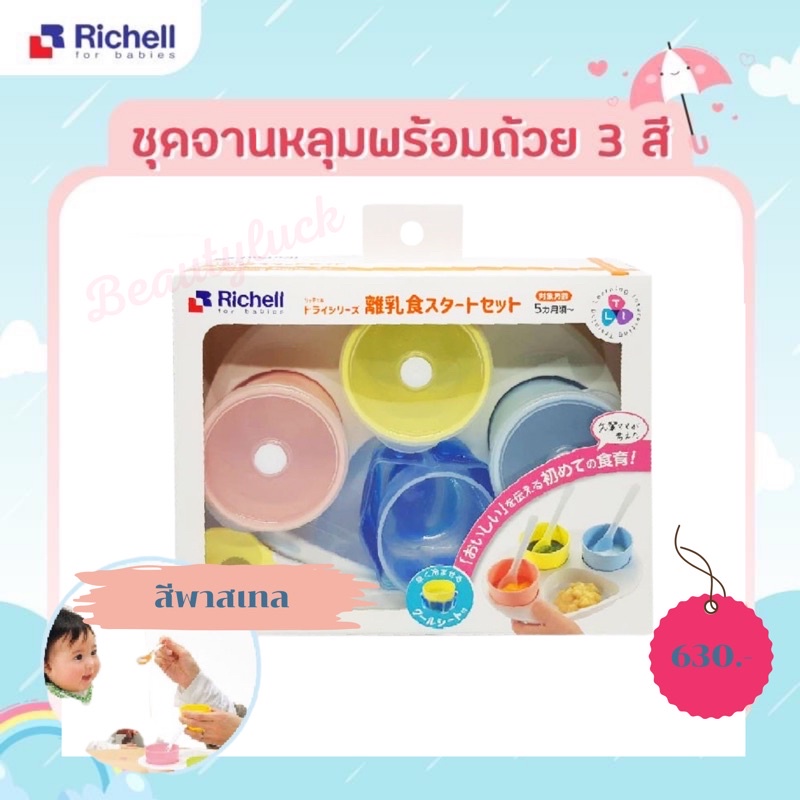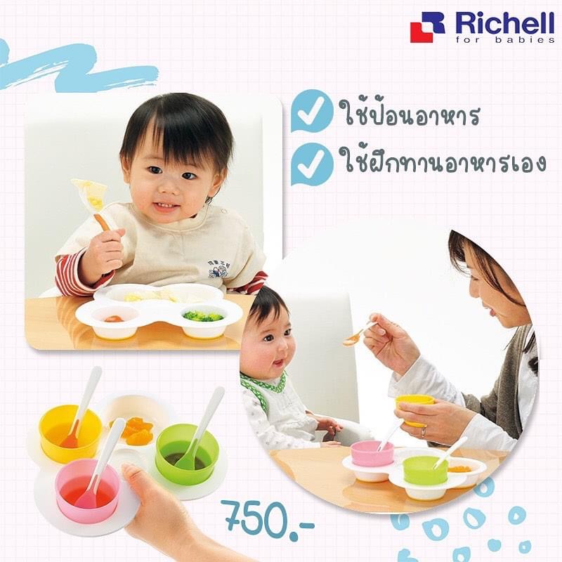 สีใหม่พาสเทล Richell (ริเชล) ชุดจานหลุมป้อนอาหารหรือฝึกทานอาหารเองสำหรับเด็ก มีจานหลุมและถ้วยน่ารักสดใส