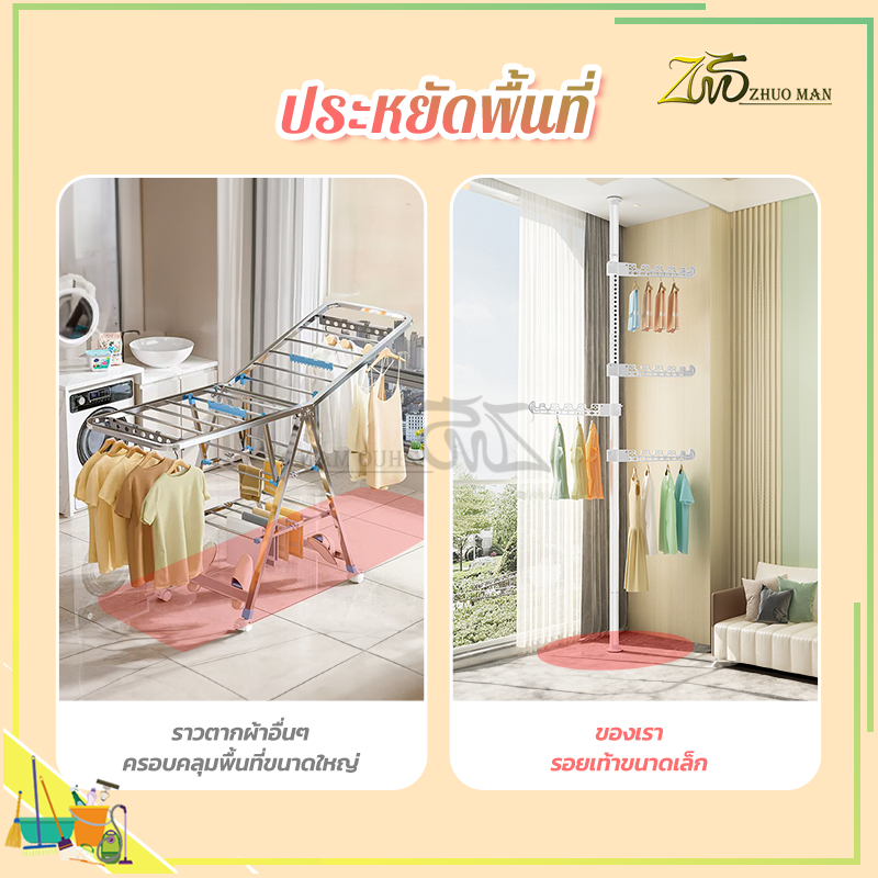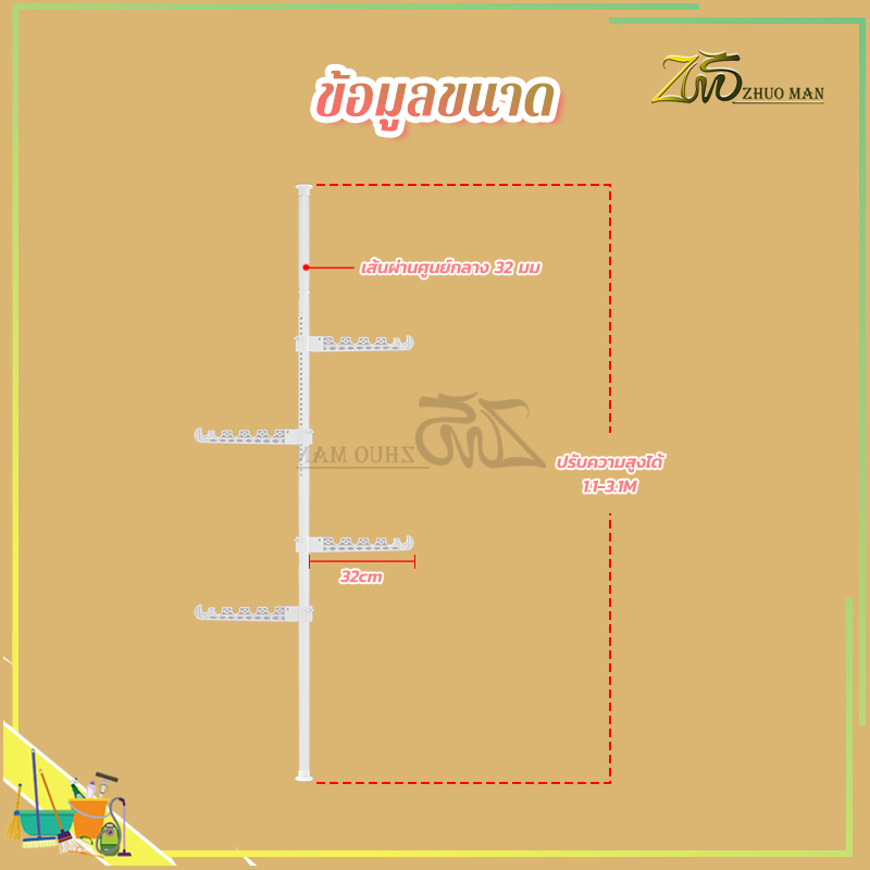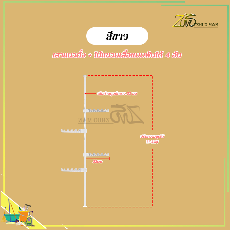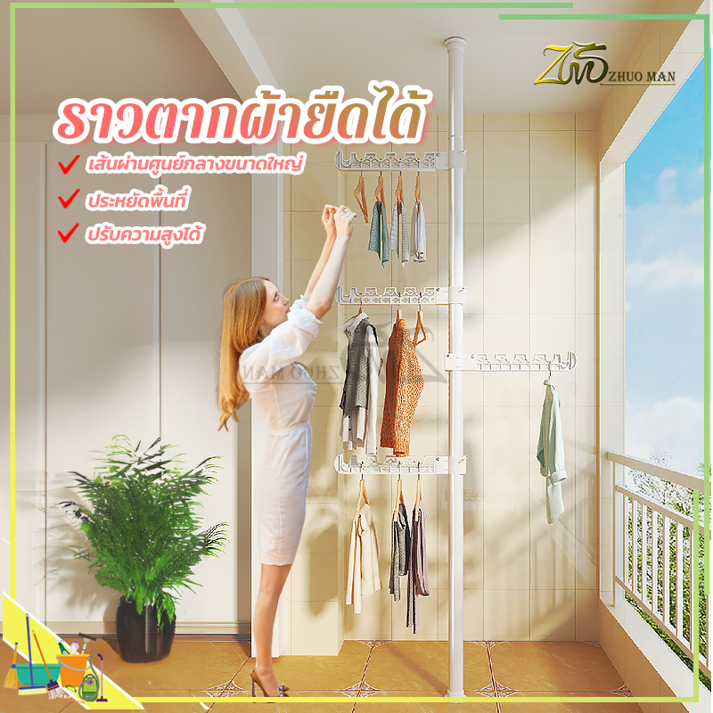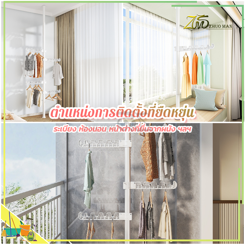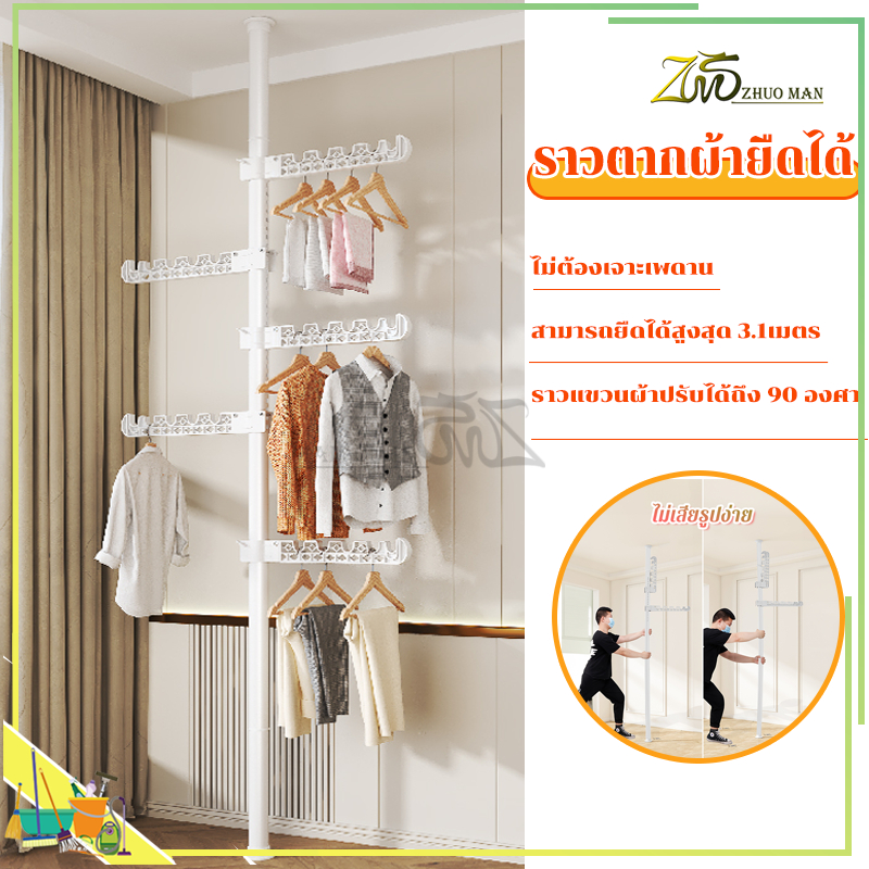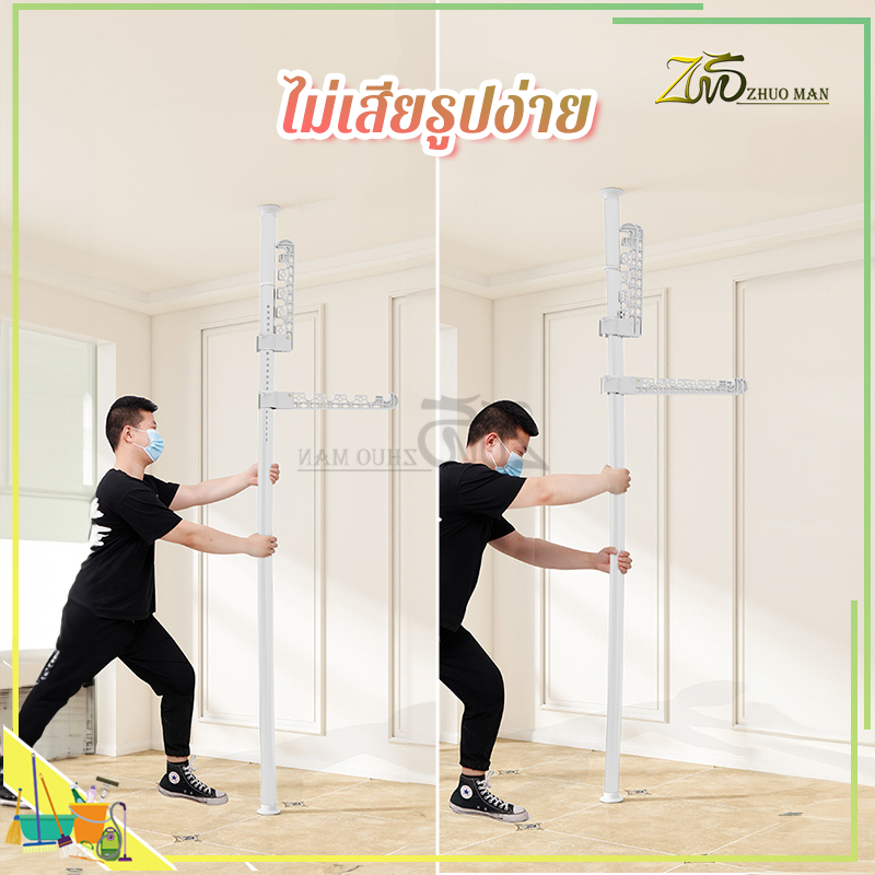 ราวตากผ้ายืดได้ ราวเเขวนผ้า คุณภาพสูง ไม่ต้องเจาะเพดาน ยืดหดได้ สูงสุด 3.1 เมตร แถมตัวแขวน 4 อัน รับน้ำหนักได้ 30+kg