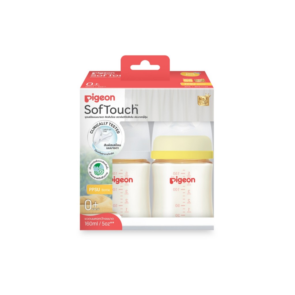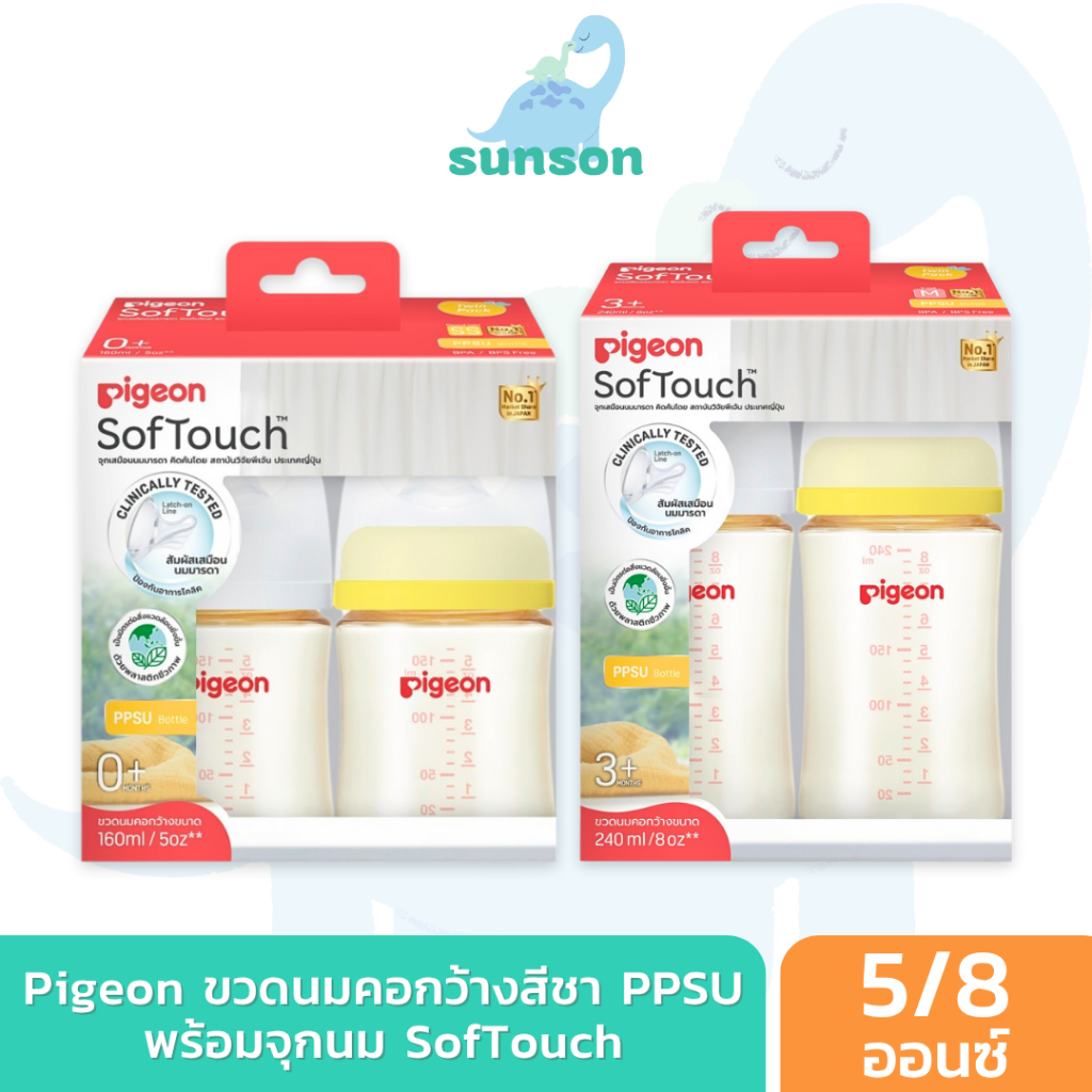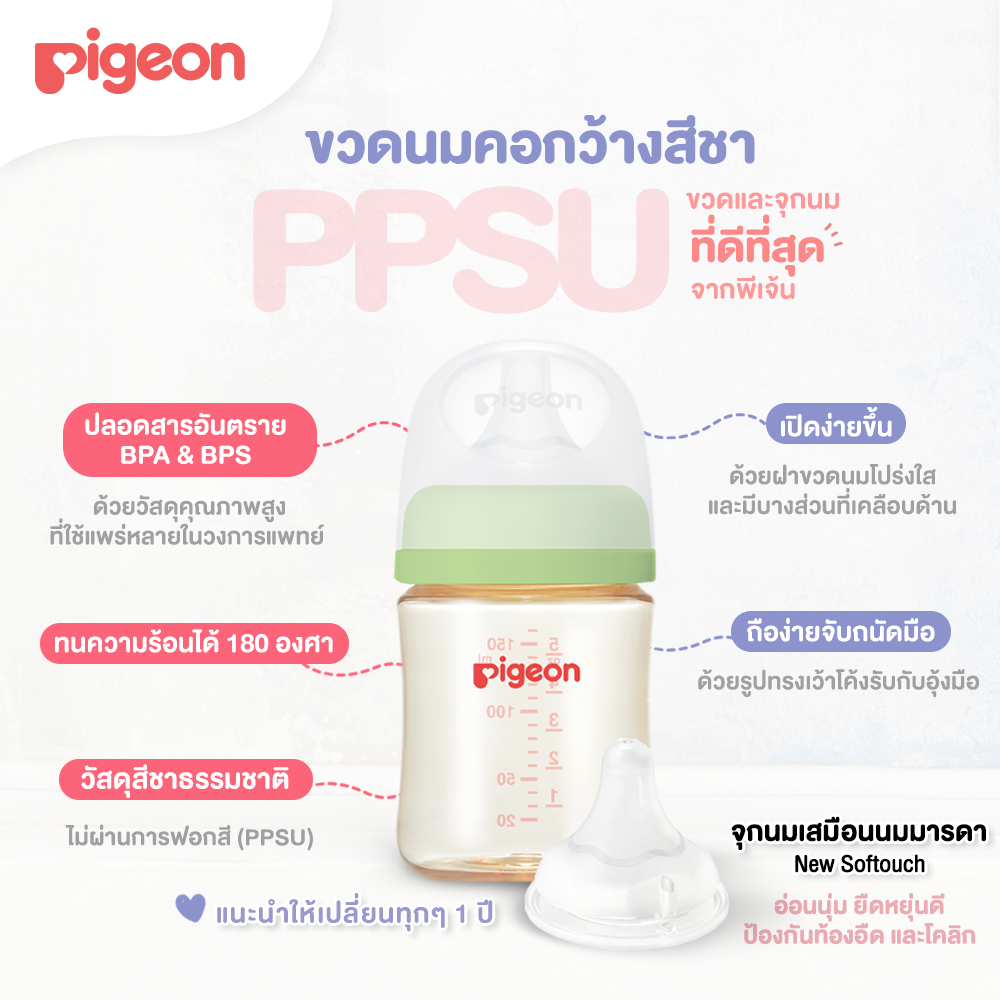 [ของแท้] Pigeon ขวดนมคอกว้าง ขวดนมสีชา พีเจ้น PPSU มาพร้อมจุกนม SofTouch (ขนาด 5/8 ออนซ์)