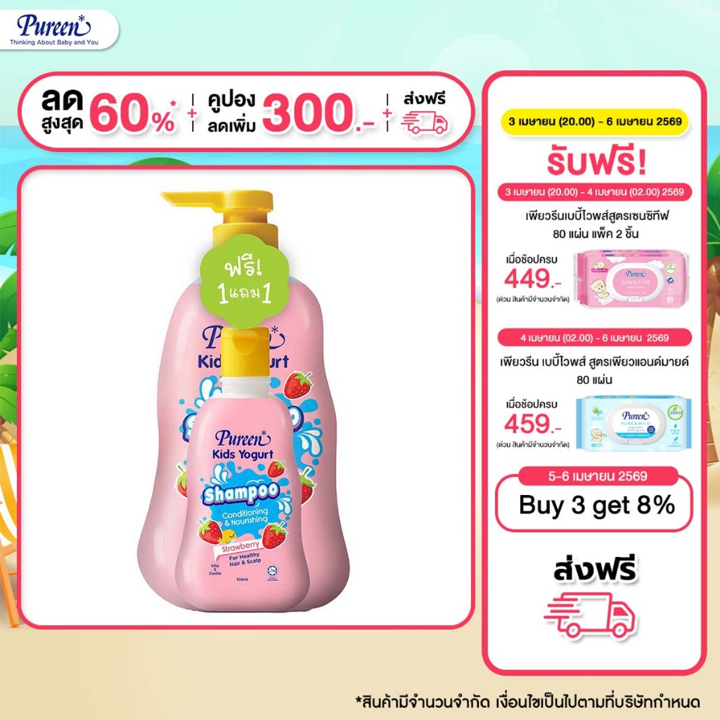 [750 ml + ของแถม 150 ml.] Pureen เพียวรีน คิดส์โยเกิร์ต แชมพู กลิ่นสตรอเบอรี่ 750 มล. แชมพูสูตรอ่อนโยนสำหรับเด็ก