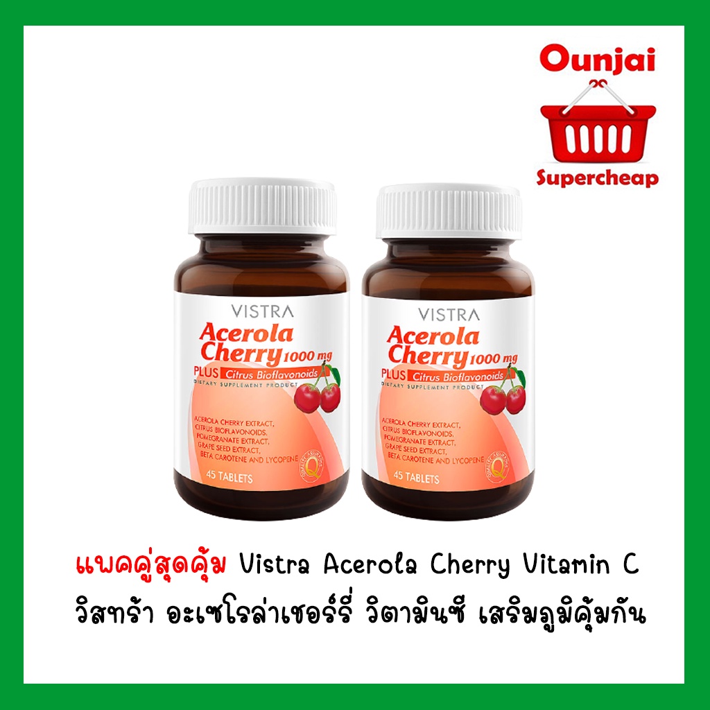 [ชุด 2 ขวด] Vistra Acerola Cherry Vitamin C 45 เม็ด วิสทร้า อะเซโรล่าเชอร์รี่ วิตามินซี เสริมภูมิคุ้มกัน 1000 mg