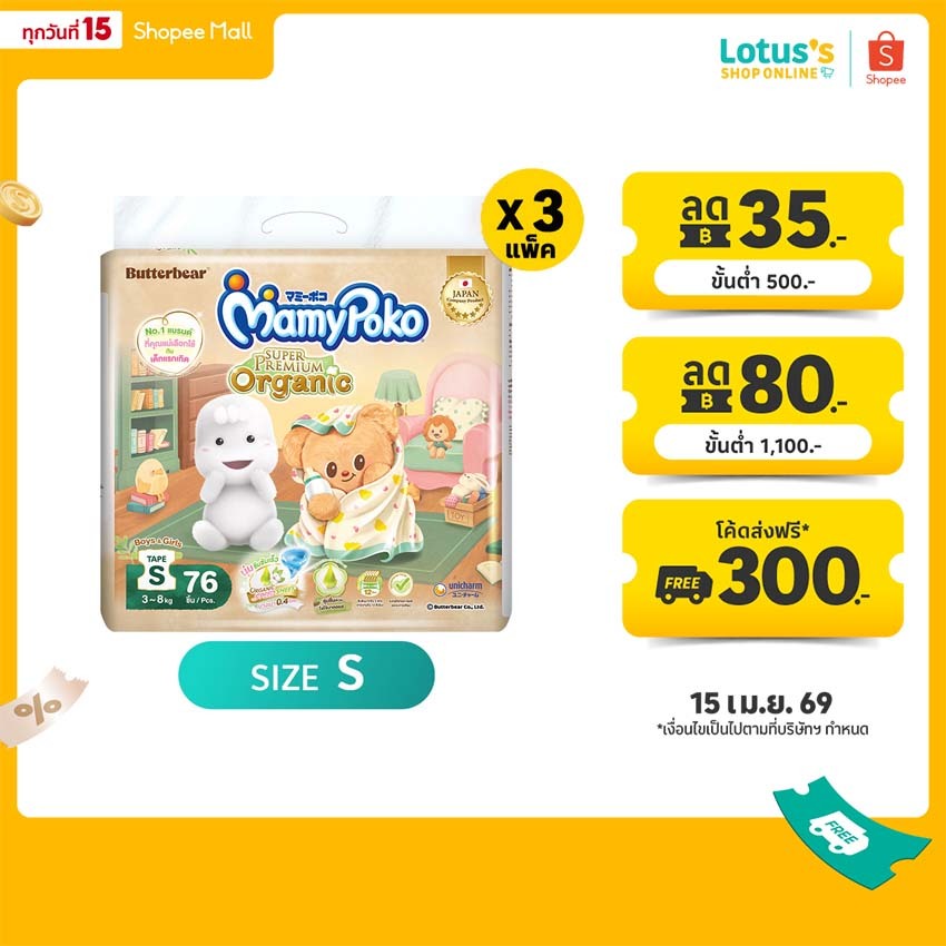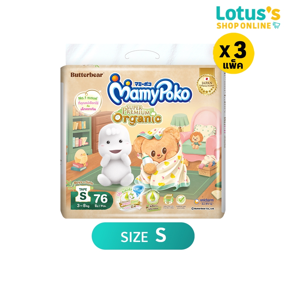 [ขายยกลัง!][รวม 3 แพ็ค ทั้งหมด 228 ชิ้น] มามี่โพโค ผ้าอ้อมเด็กแบบเทป ซุปเปอร์พรีเมี่ยม ออแกนิค S 76 ชิ้น MAMYPOKO PREMIU