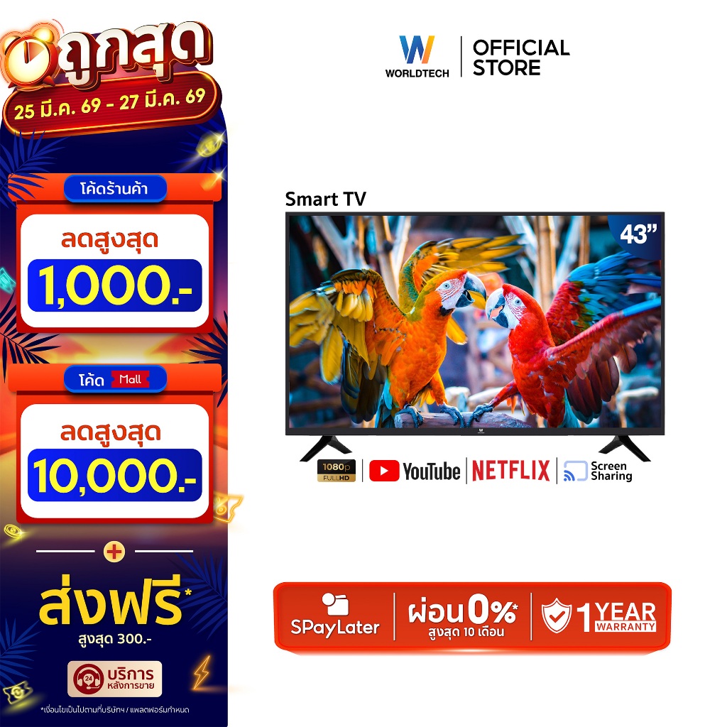 Worldtech ทีวี 43 นิ้ว แอนดรอย สมาร์ททีวี Full HD Wifi Netflix YouTube Internet รับประกัน 1 ปี